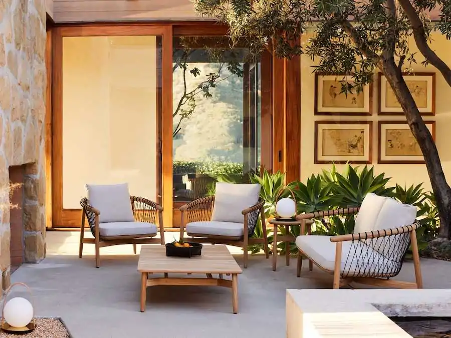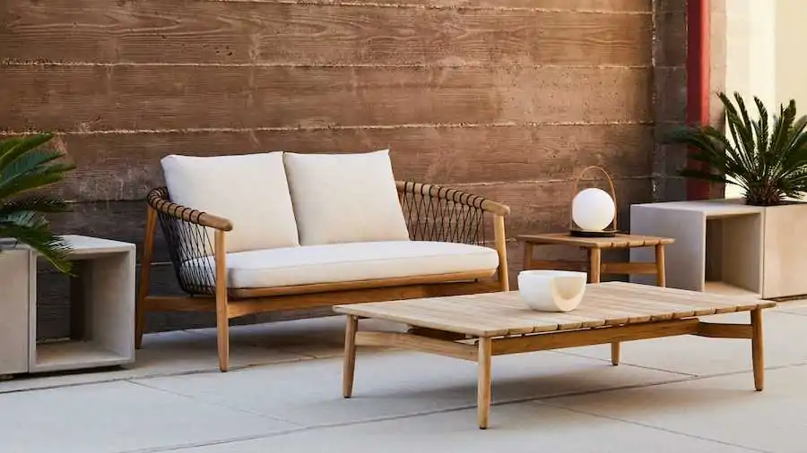 The coffee table is marked by a hallmark of the Crosshatch family: sophisticated wood joinery—for this piece, in teak—by design firm EOOS.