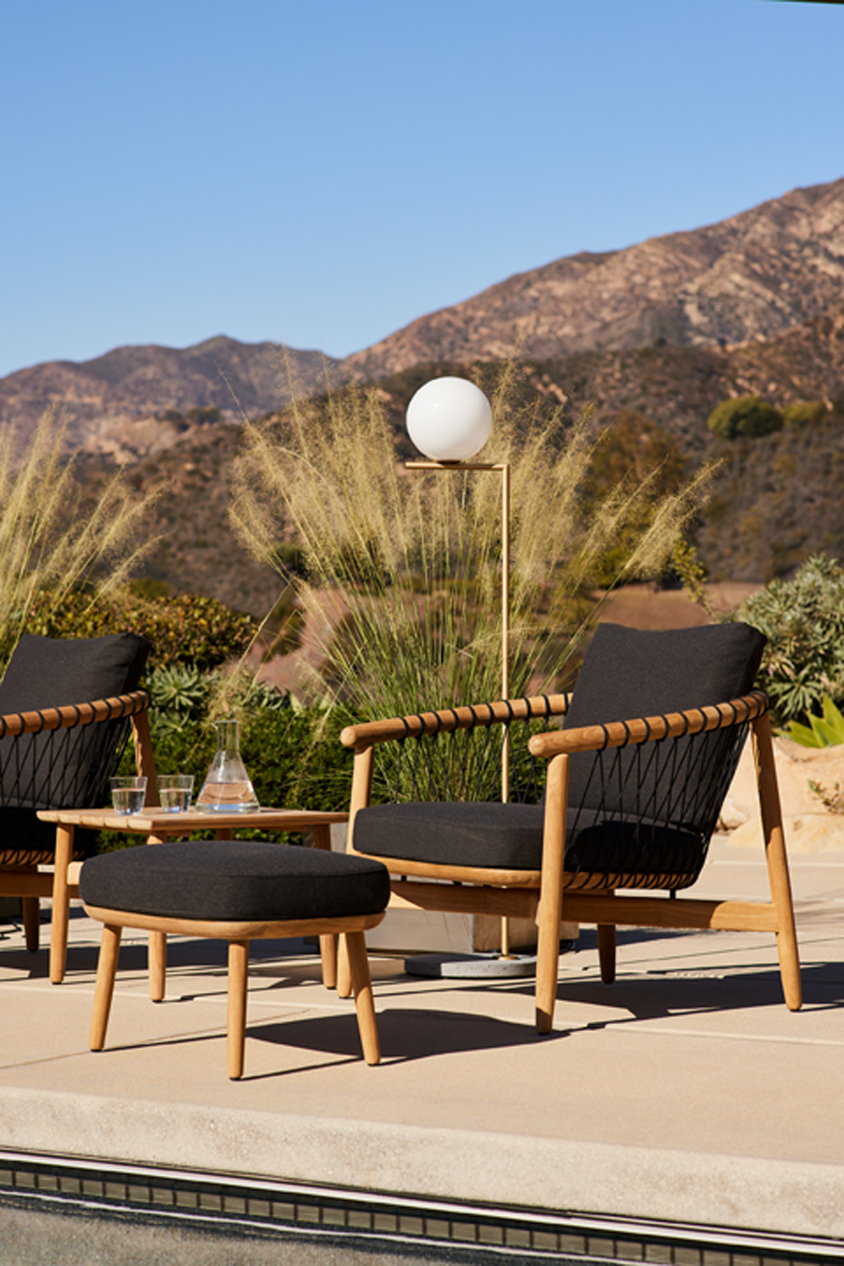The chair and ottoman are intricately crafted with durable teak. The cushions, which can be tied down, are outfitted in a weather-resistant fabric available in two colorways.