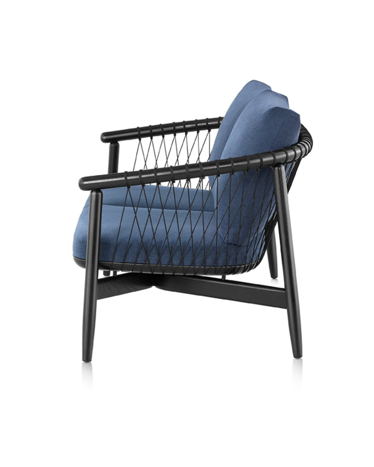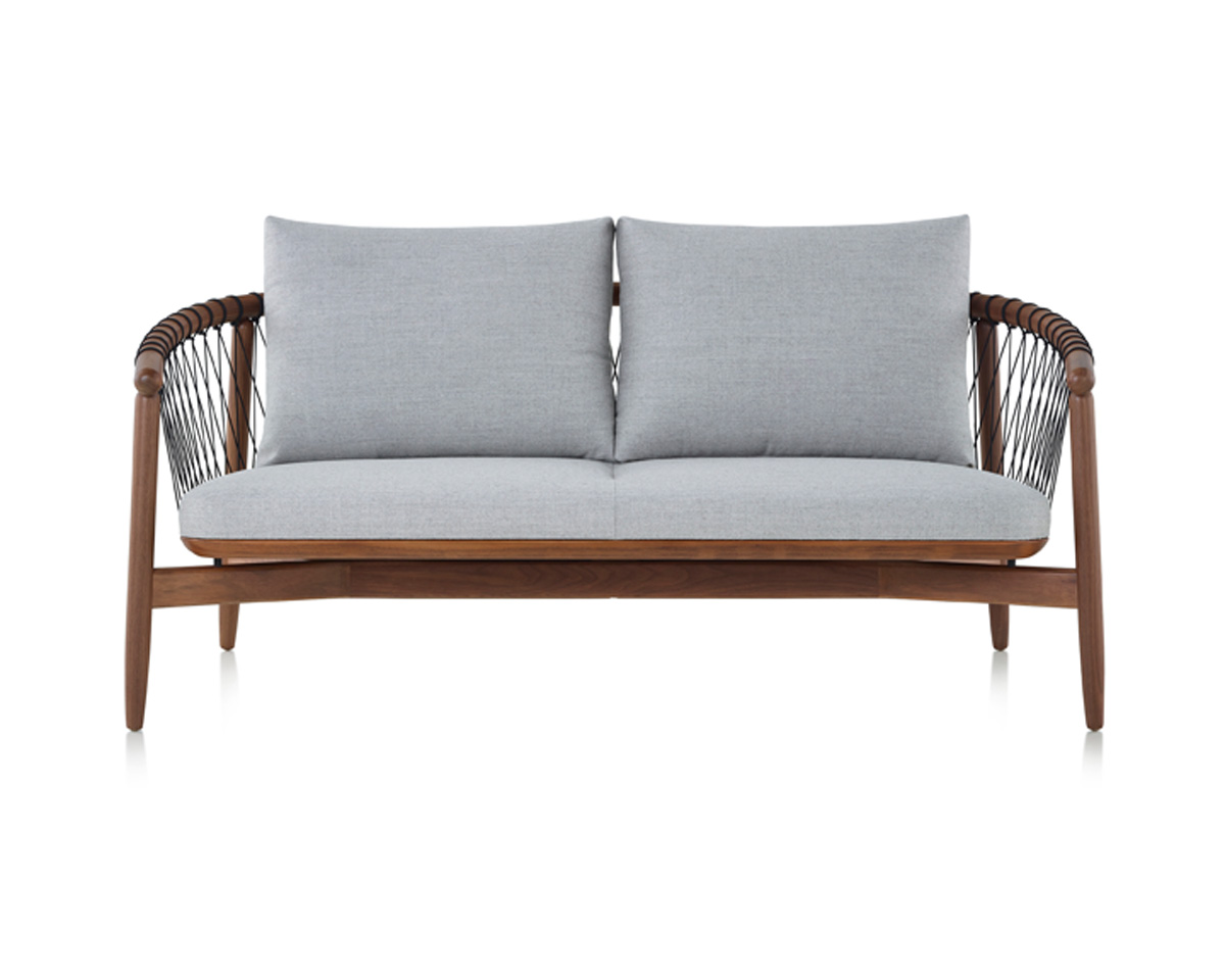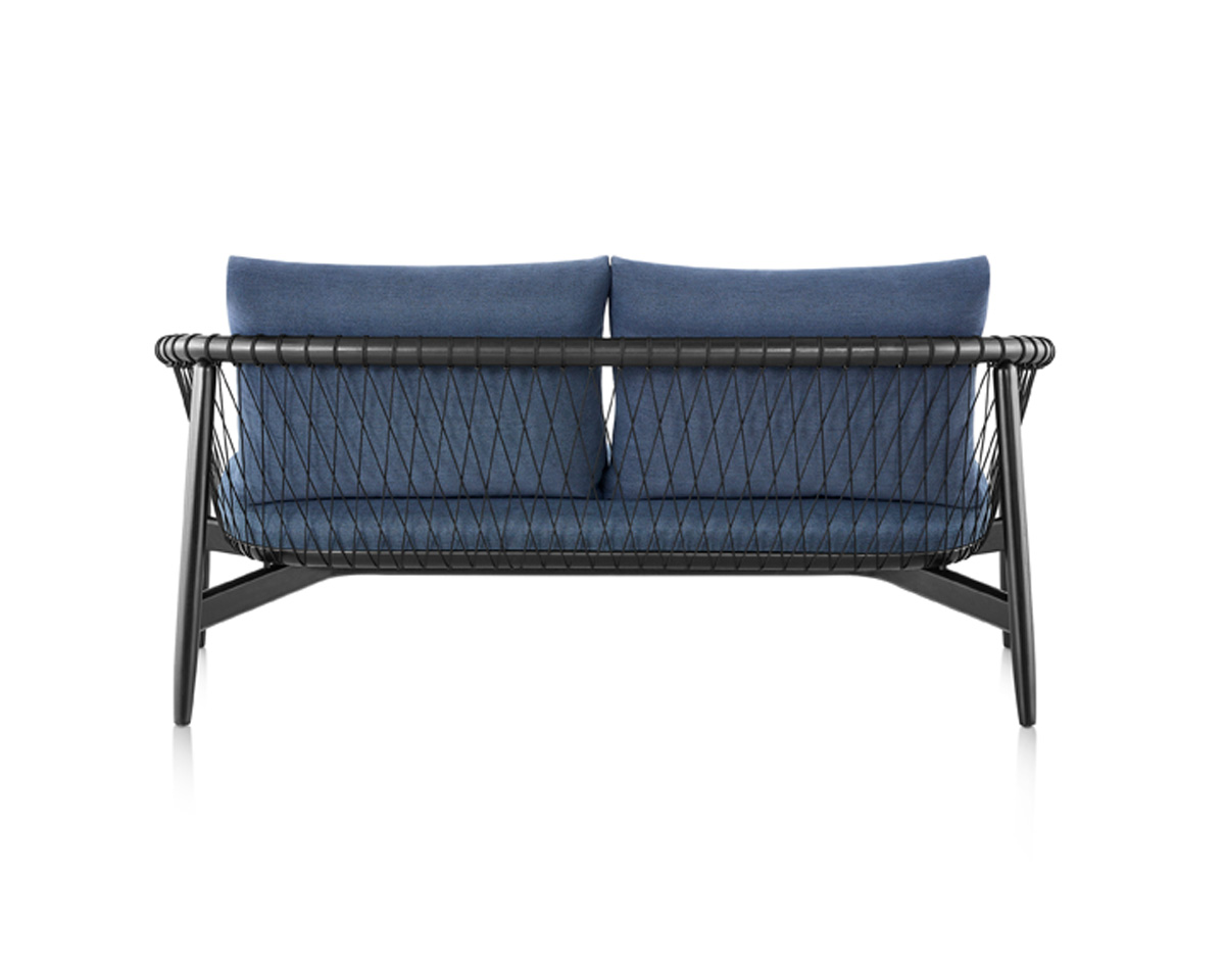A lattice of hand-strung parachute cords gives the Crosshatch Settee its lightweight, transparent silhouette. A welcome extension of the Crosshatch Chair family, it seats up to two people. The settee is available in a wide selection of wood frame finishes, upholstery options, and cord colors.