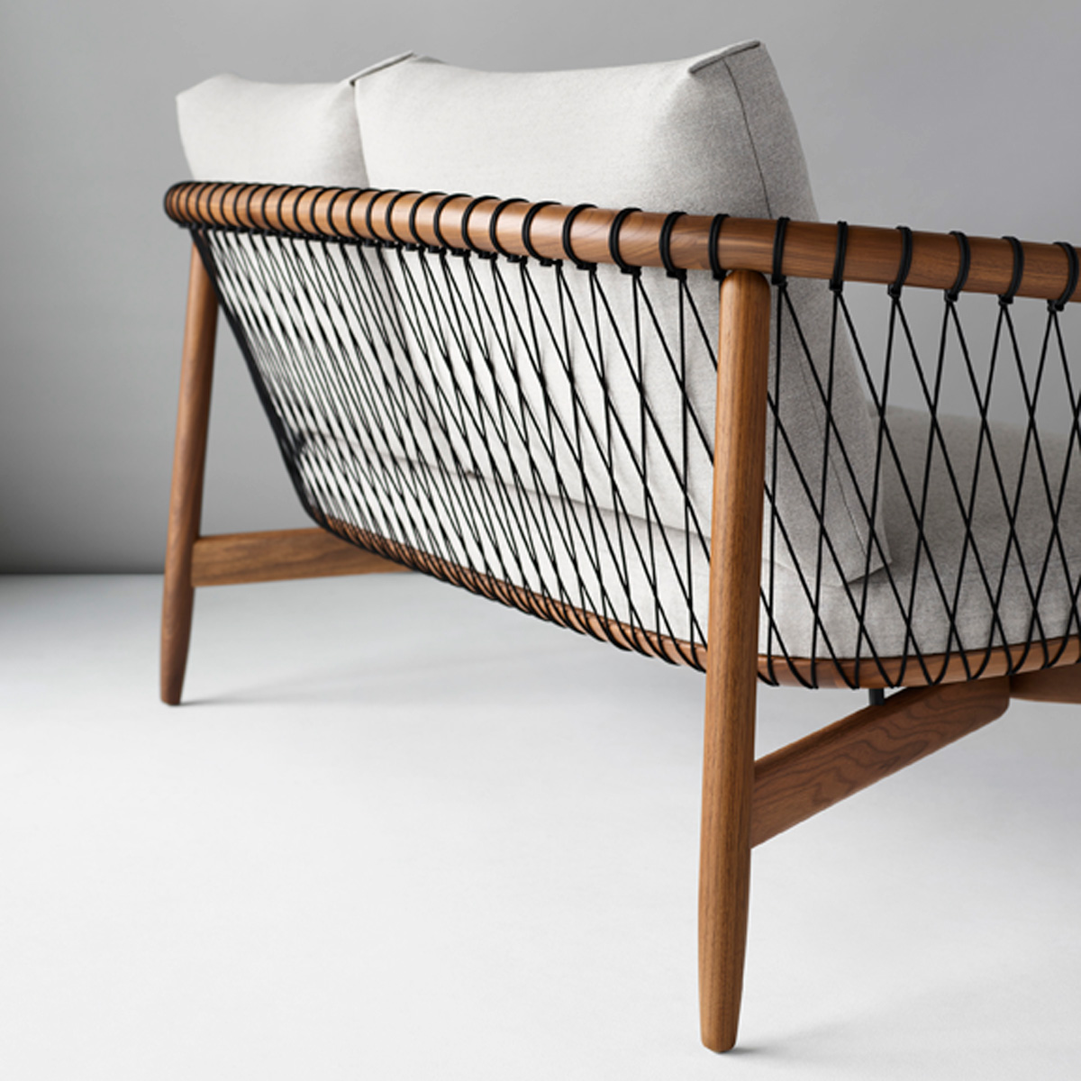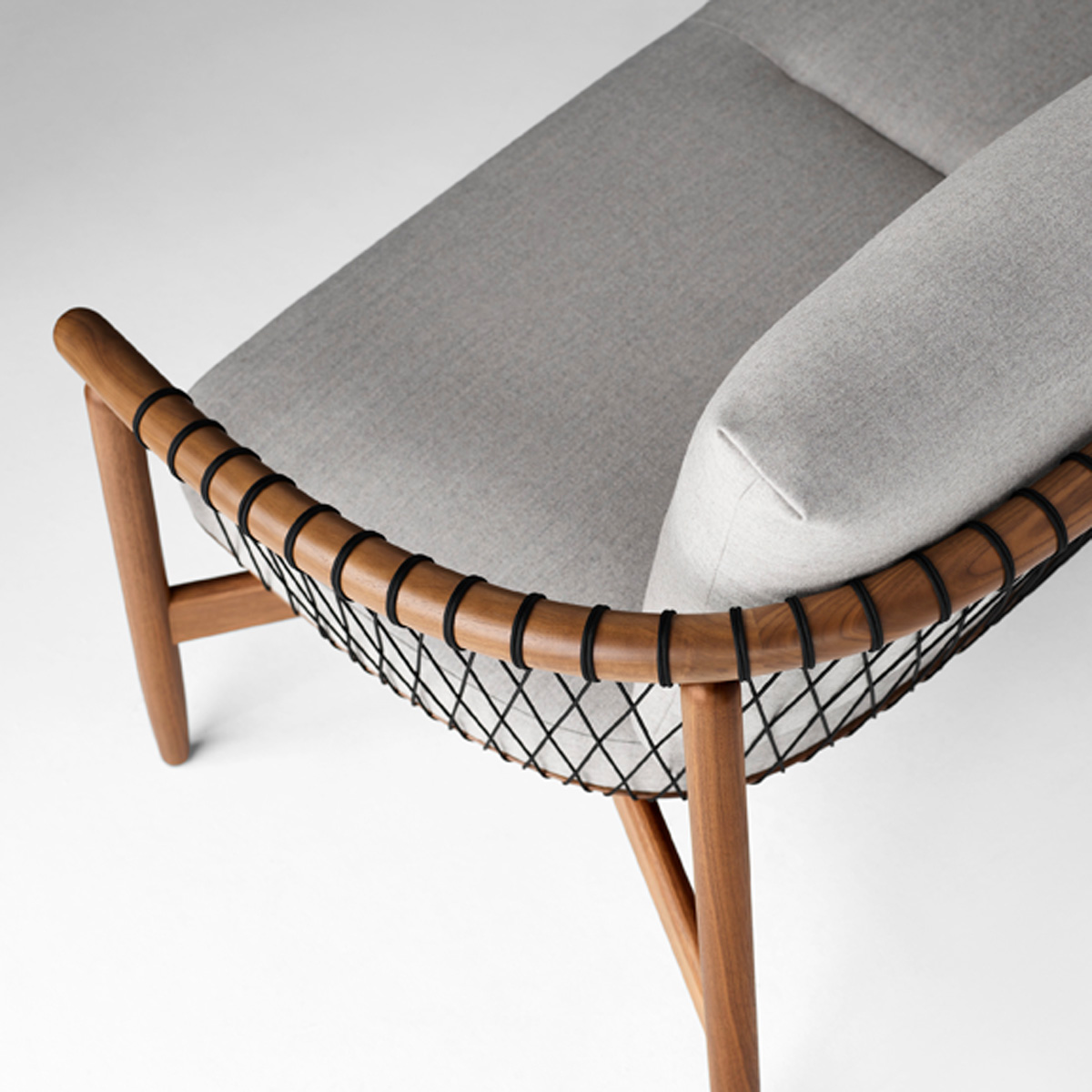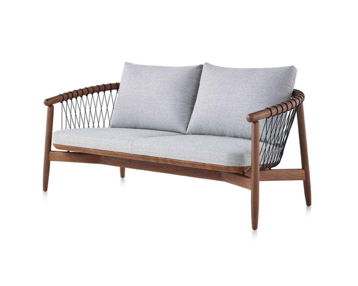 A lattice of hand-strung parachute cords gives the Crosshatch Settee its lightweight, transparent silhouette. A welcome extension of the Crosshatch Chair family, it seats up to two people. The settee is available in a wide selection of wood frame finishes, upholstery options, and cord colors.