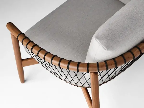 A lattice of hand-strung parachute cords gives the Crosshatch Settee its lightweight, transparent silhouette. A welcome extension of the Crosshatch Chair family, it seats up to two people. The settee is available in a wide selection of wood frame finishes, upholstery options, and cord colors.