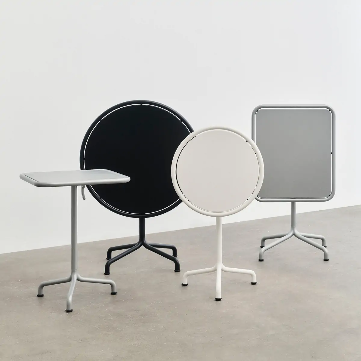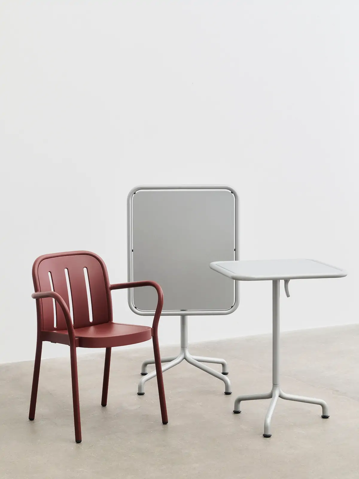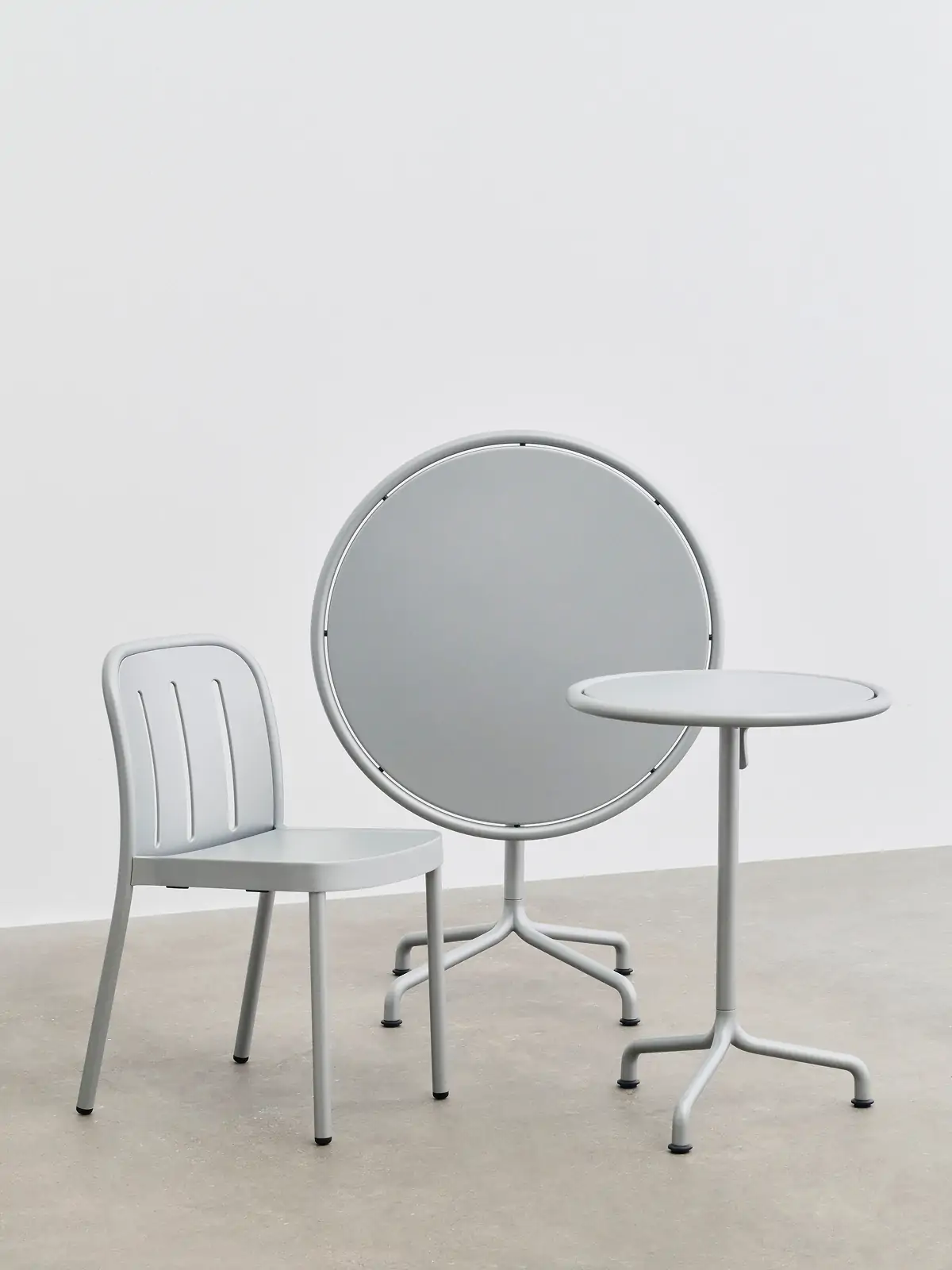 A contemporary take on the classic bistro set, Julien Renault’s Deville Table reinterprets a familiar typology for today’s outdoor life. Defined by its generous proportions and softly curved frame, the table balances strength with an open, welcoming character – an invitation to sit, linger, and enjoy time outside. Crafted from at least 60% post-consumer recycled aluminium, the rust-resistant table is built to last, while its tilting top makes it easy to move, fold away, and store. Offered in round or square variants in different sizes and colours, the Deville Table offers practicality with quiet nostalgia, adapting easily to balconies, patios, cafés, terraces, and gardens.