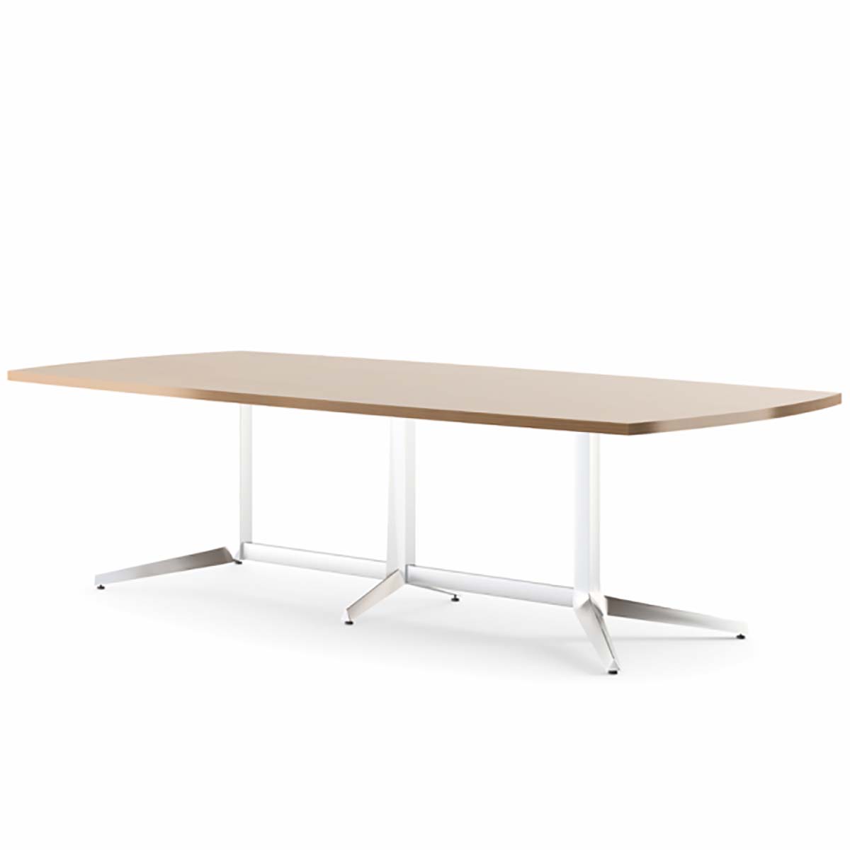 Dividends Horizon conference tables are available in racetrack, rectangular, or boat shape and in all standard Dividends Horizon finishes. A conference table base assembly includes two Y legs, one center support T base, and two horizontal stretchers that connect the three bases.