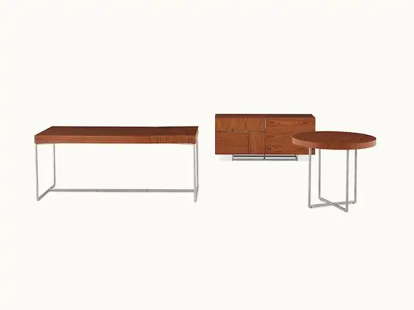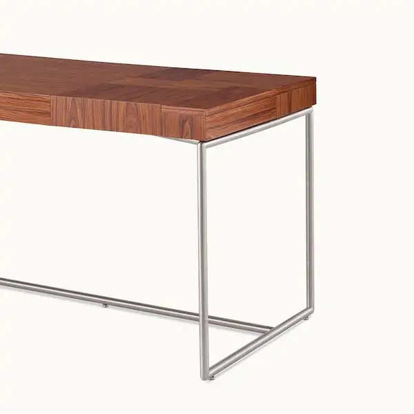 Designed for the private office, Isay Wienfeld’s Domino Desk offers an elegant aesthetic, with clever storage and luxe veneer finishes that complement his Domino family. Optional modular compartments open with a gentle touch to reveal out-of-sight storage. Supported by an open metal base, the prominent work surface invites you to sit and focus on the task at hand.