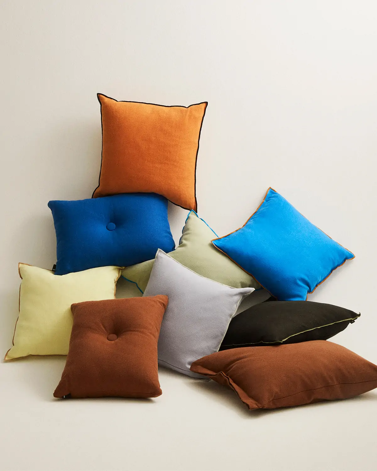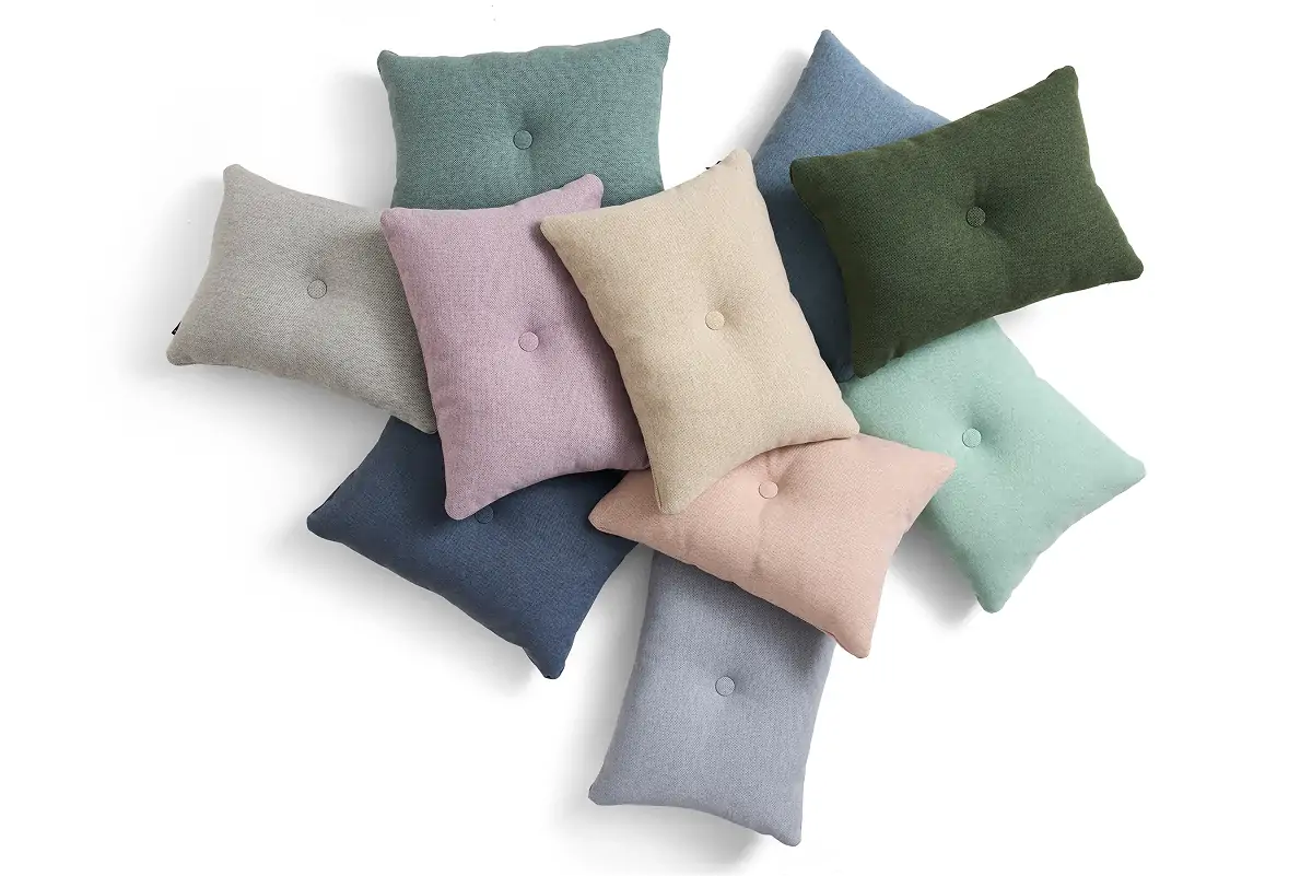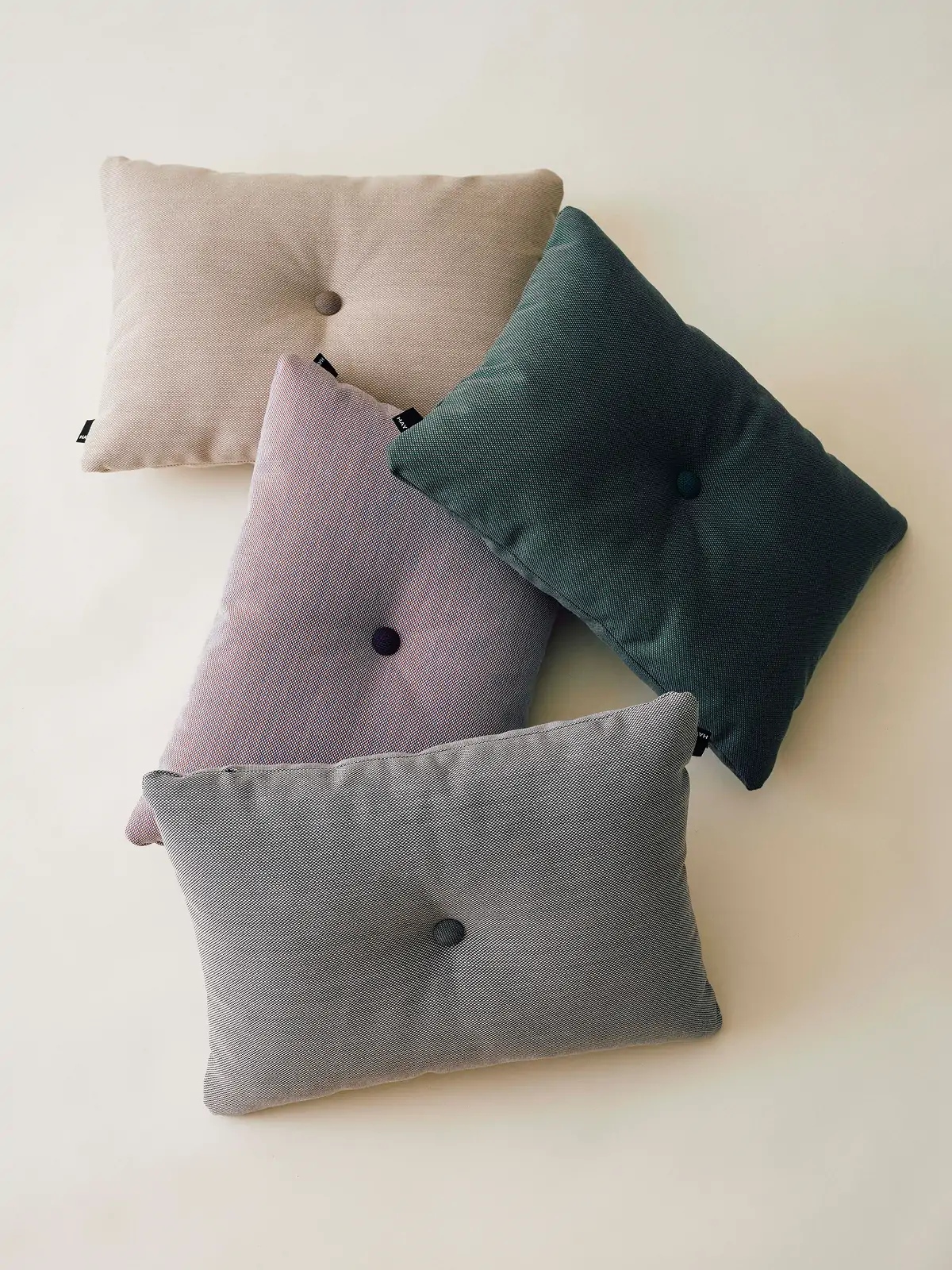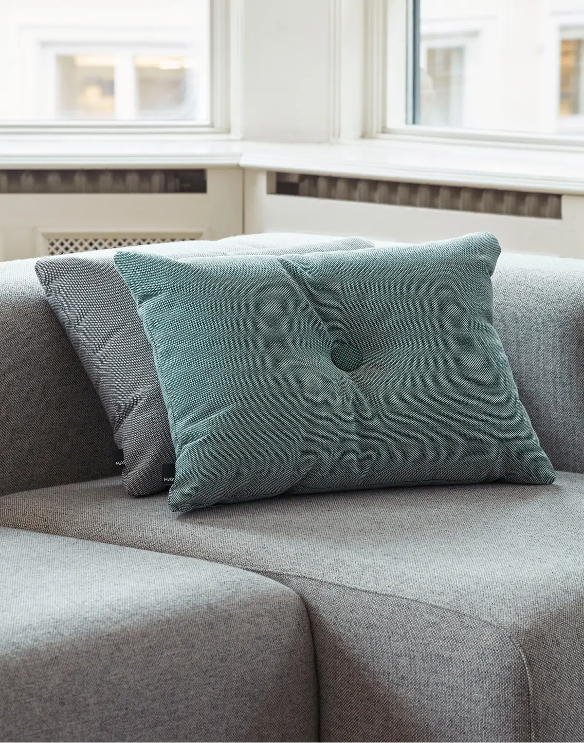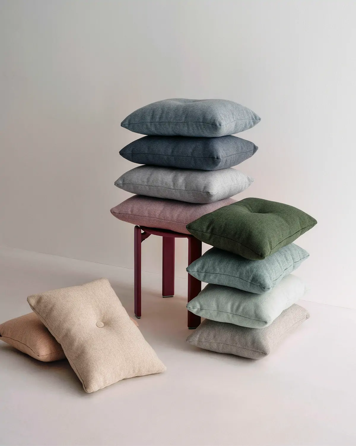 Characterised by the small, covered buttons in the centre of the cushion, Dot Cushion is a HAY classic that adds comfort, colour, and texture to any interior space. Offered in different fabrics specially selected for their aesthetic and functional qualities, they feature a recycled polyester filling and are available in a wide palette of versatile colours spanning light neutral shades and pastels to darker tones.