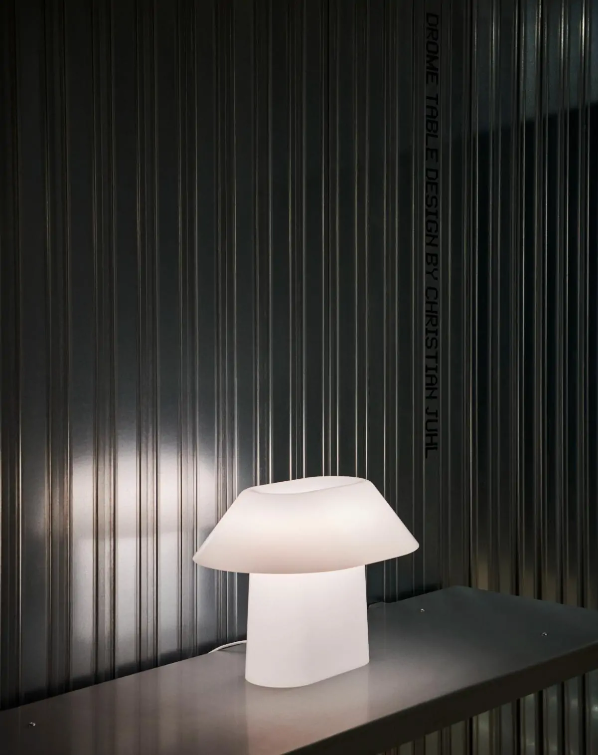 Drome is a versatile table lamp defined by its distinctive oval shape. The lamp’s stretched elliptical form changes the perception of the lamp, depending on which angle it is viewed from. Concealed inside the hollow form is a replaceable integrated light source, creating a unified, minimalistic silhouette that enables light to glow through it. The inline step dimmer allows the light output to be adjusted, making the lamp a versatile light source that can be used to create atmosphere in a variety of environments and settings, from a bedside table or desk to a windowsill or bookshelf.