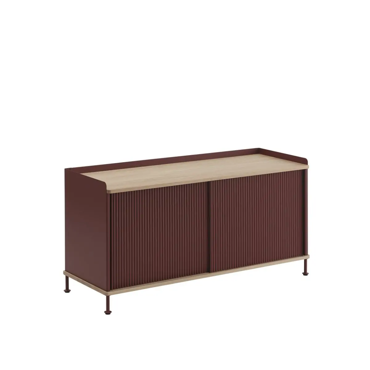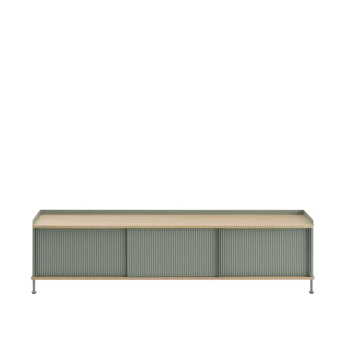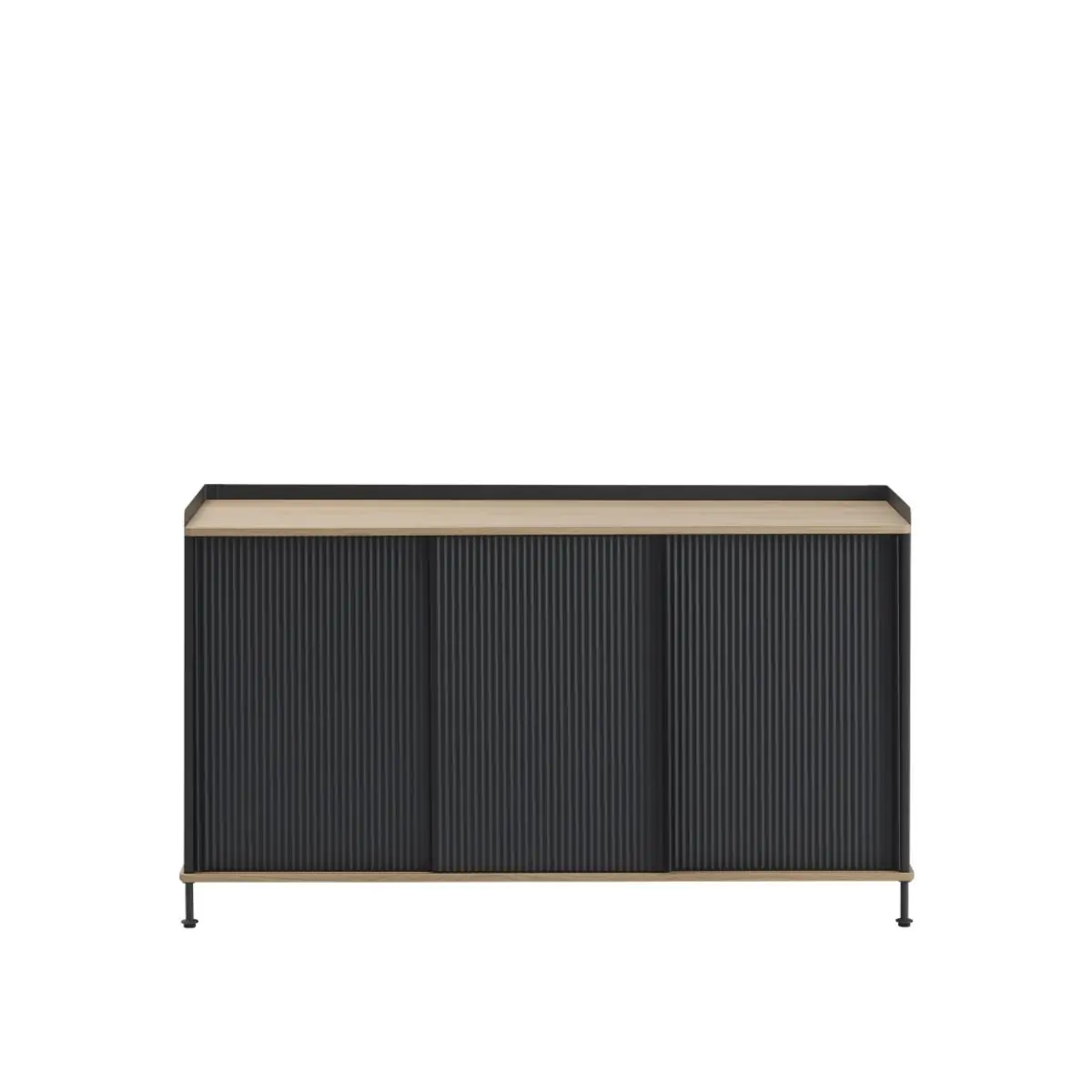 The Enfold Sideboard combines industrial materiality with residential references for a new perspective on modern storage. Made from a lacquered steel that gently enfolds its top and bottom in solid oak, the Enfold Sideboard fuses cold and warm materials for a unique expression, paired with the vibrantly modern expression of its ridged steel doors. The flexible design is available in four sizes, which all have adjustable shelves and discreet cable outlets. This offers the opportunity to find just the right fit for your space, function and needs — be it a media console, in the hallway or a tall sideboard for storage.