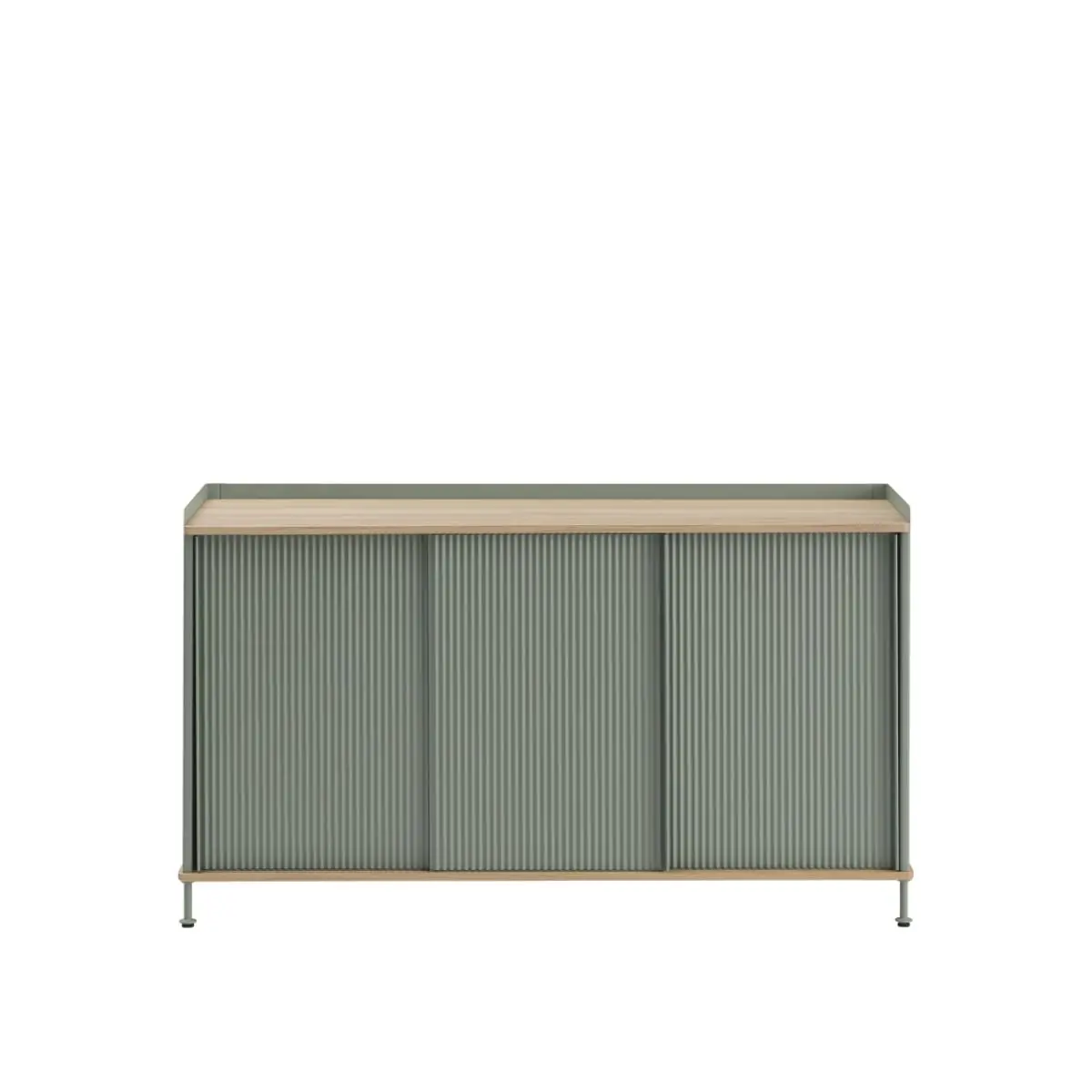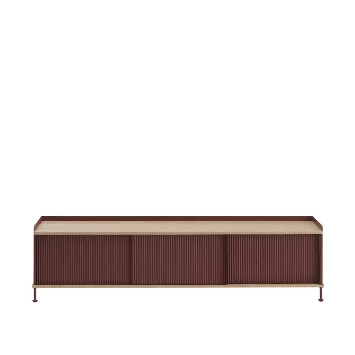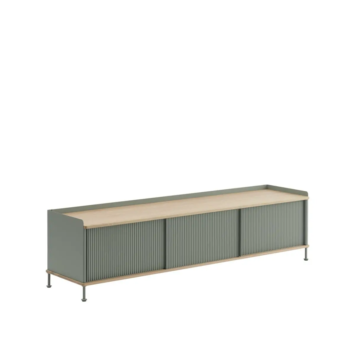 The Enfold Sideboard combines industrial materiality with residential references for a new perspective on modern storage. Made from a lacquered steel that gently enfolds its top and bottom in solid oak, the Enfold Sideboard fuses cold and warm materials for a unique expression, paired with the vibrantly modern expression of its ridged steel doors. The flexible design is available in four sizes, which all have adjustable shelves and discreet cable outlets. This offers the opportunity to find just the right fit for your space, function and needs — be it a media console, in the hallway or a tall sideboard for storage.