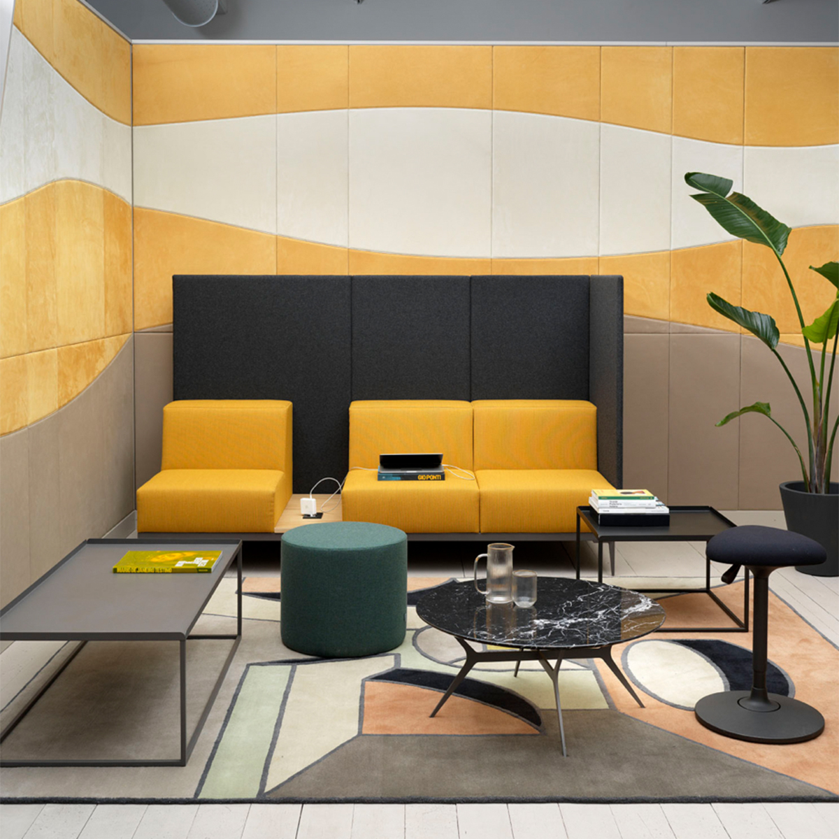 With a refined and modern look, the sofas collection – one, two or threeseater – and Felicity bench, is composed with a soft quilted seat, completed with minimal and functional wooden support elements such as the side table top which eases a correct and practical organization of spaces. Particularly suitable for contract spaces, thanks also to integrated electrical devices – such as USB ports – Felicity is now also available with a “wall” accessory, which can integrate existing modules to promote privacy.