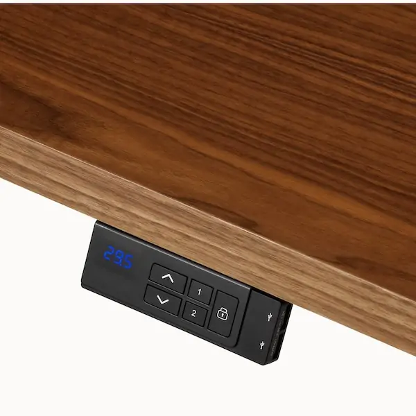 The handset controller with monitor display on the front of the desktop controls the rise and fall of the desk and easily powers devices. Integrated power receptacle, USB, and USB-C on the work surface add another option for charging as well as wire management. All cables are shrouded beneath the work surface to protect and conceal wires.