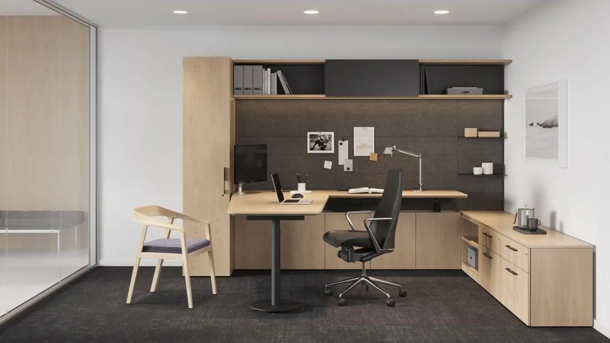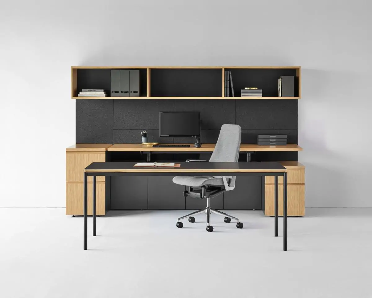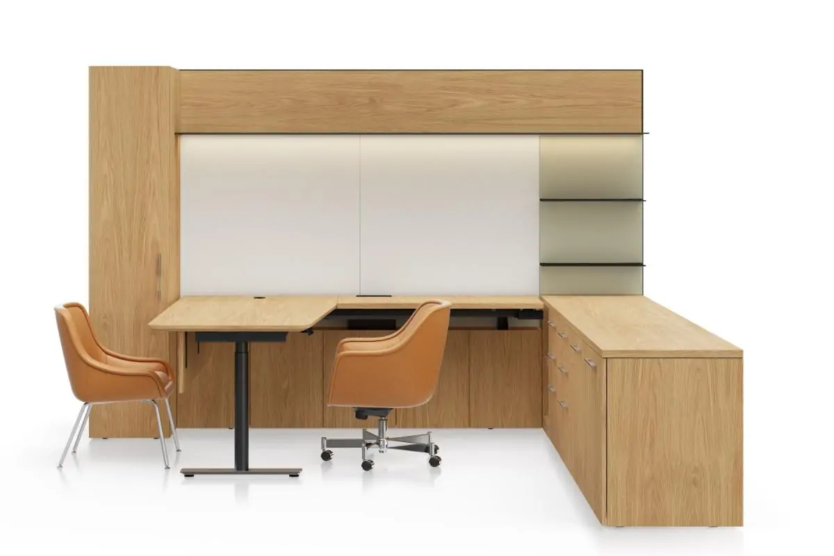 Height-adjustable, sit-to-stand work surfaces are the rule, not the exception—including L-shaped and cantilevered work surfaces. Choose from a freestanding desk, as well as a selection of leg styles, top shapes, and materials to help improve the ergonomics of any private office.