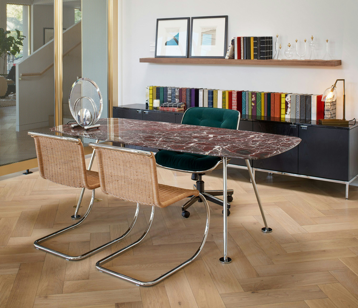 The iconic Grasshopper Dining Table from Knoll is as beautiful as it is practical. A precision-crafted steel base supports a surface crafted from premium marble or glass. Available in a range of sizes and round or rectangular tabletops, this iconic table brings an element of refinement to meeting rooms or lounge spaces.