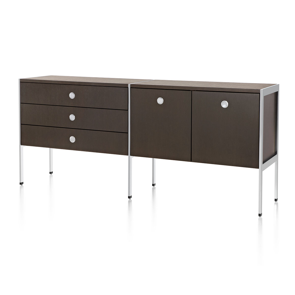 Updated with modern mechanisms and new material options, Ward Bennett’s credenza offers an exquisitely modular solution for display and storage. The design varies in width from one to four units that may be configured with open shelves, drawers, and doors to allow it to easily suit any elegant environment in the home or at the office.