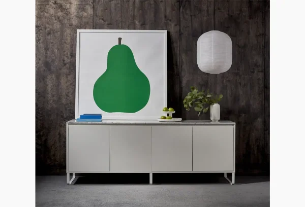 A sleek combination of wood and chrome, H Frame Storage reveals its designer’s modernist side. Ward Bennett devised this modular approach to storage, with flexible units of open shelving, enclosed cabinets, file drawers, or box drawers, each bracketed by a metal H-shaped frame. Units can be configured into two-, three-, or four-unit credenzas in an exacting grid that’s finished from all sides, so they can function as low-profile room dividers.