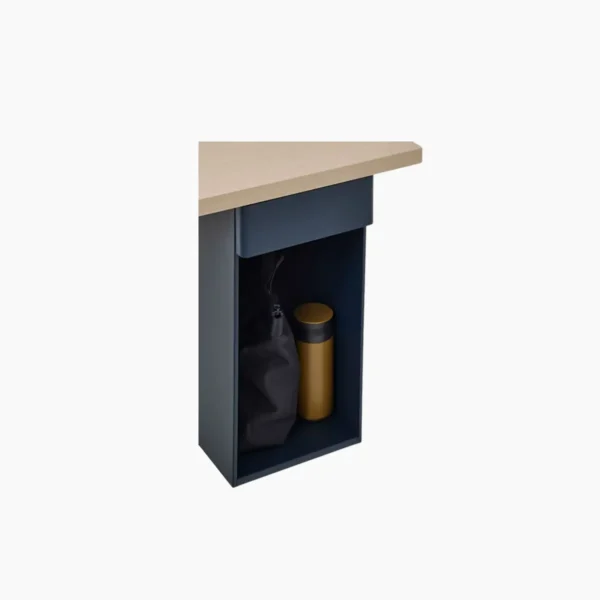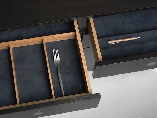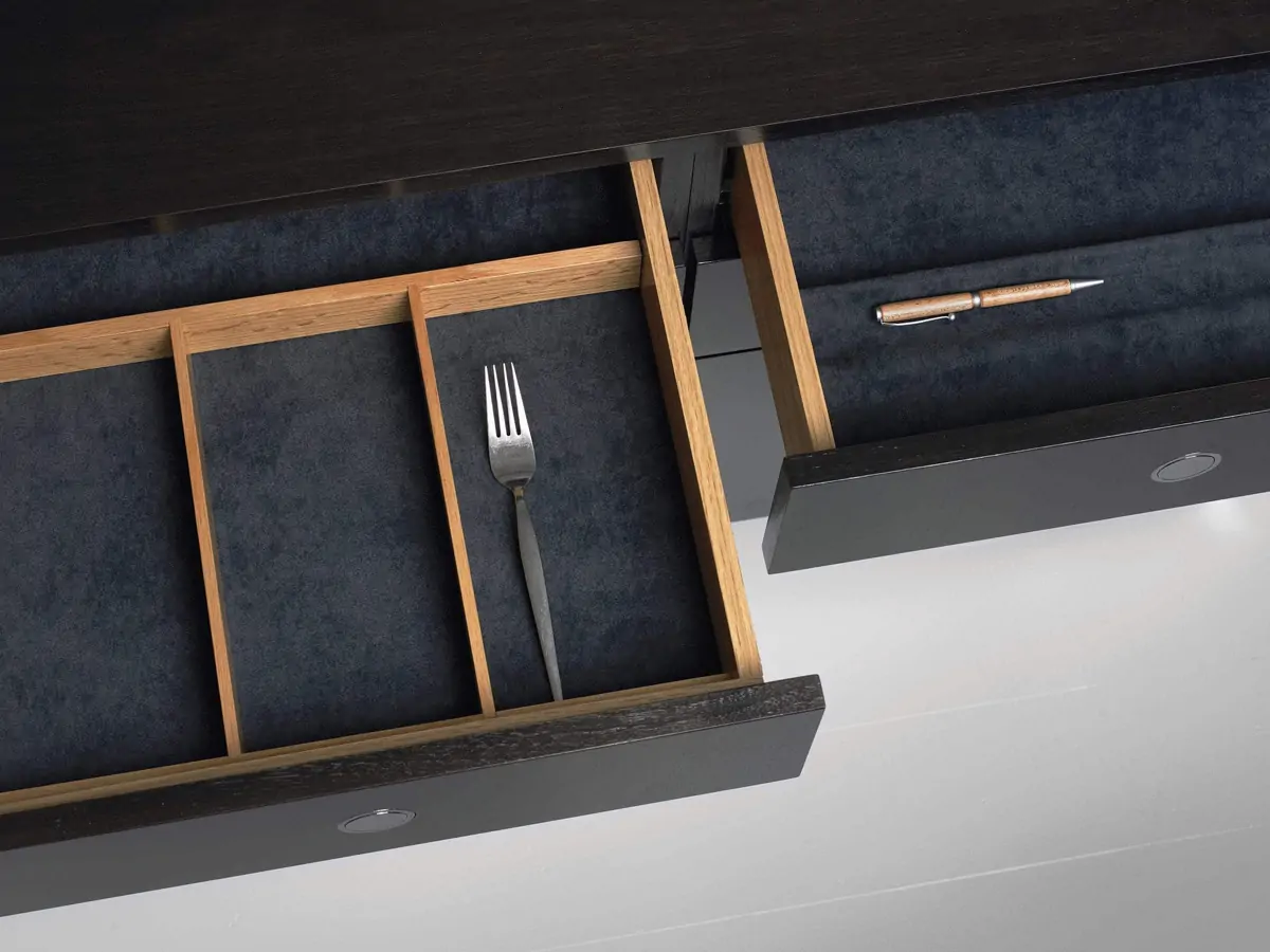 Drawers feature automatic, soft-closing glides and optional inserts for organizing supplies.