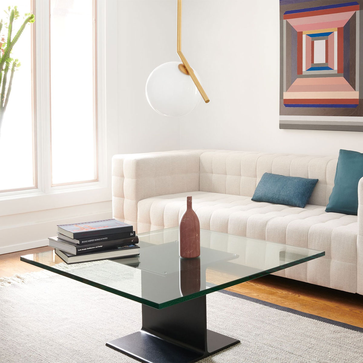 A versatile pedestal, side table, or coffee table, Ward Bennett’s I Beam Tables pay tribute to modern architecture and industrial exactness. Crafted from powder-coated cast aluminum and either left bare or topped with glass or stone, the I Beam Tables offer an auxiliary surface and a witty artistic statement.