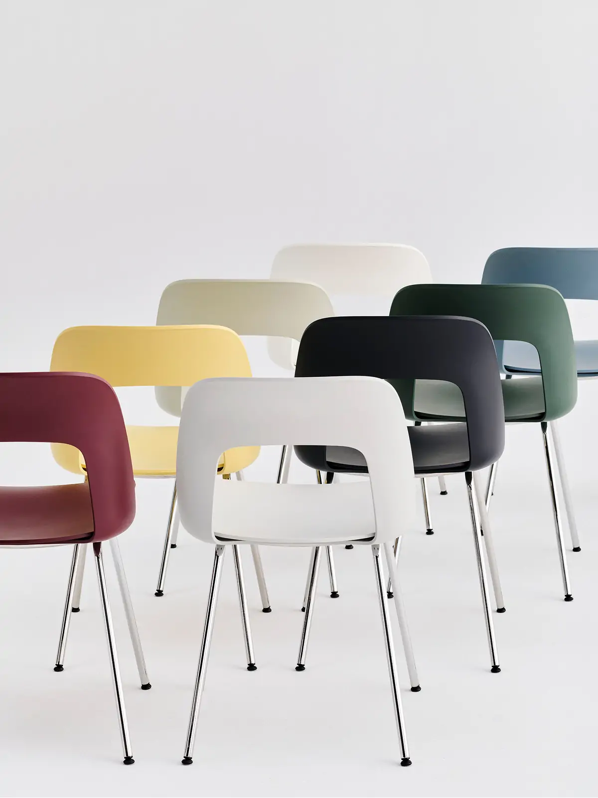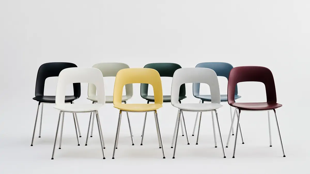 Designed by Julien Renault, Layout Chair 111 offers a flexible and innovative design shaped by a commitment to comfort, functionality, and circularity. Characterised by the opening in the backrest, this defining feature provides greater comfort while giving its appearance a sense of lightness and transparency. Featuring slim tubular legs that combine stability with an elegant aesthetic, all chair components can be fully disassembled to extend its lifespan and enable refurbishment for long-term use. The shell and seat are crafted from a minimum of 96% post-consumer recycled plastic and offered in a wide range of colours, with the frame available with a chrome or powder coated finish, making Layout a versatile and durable seating solution ideal for offices, restaurants, public institutions, and domestic settings.