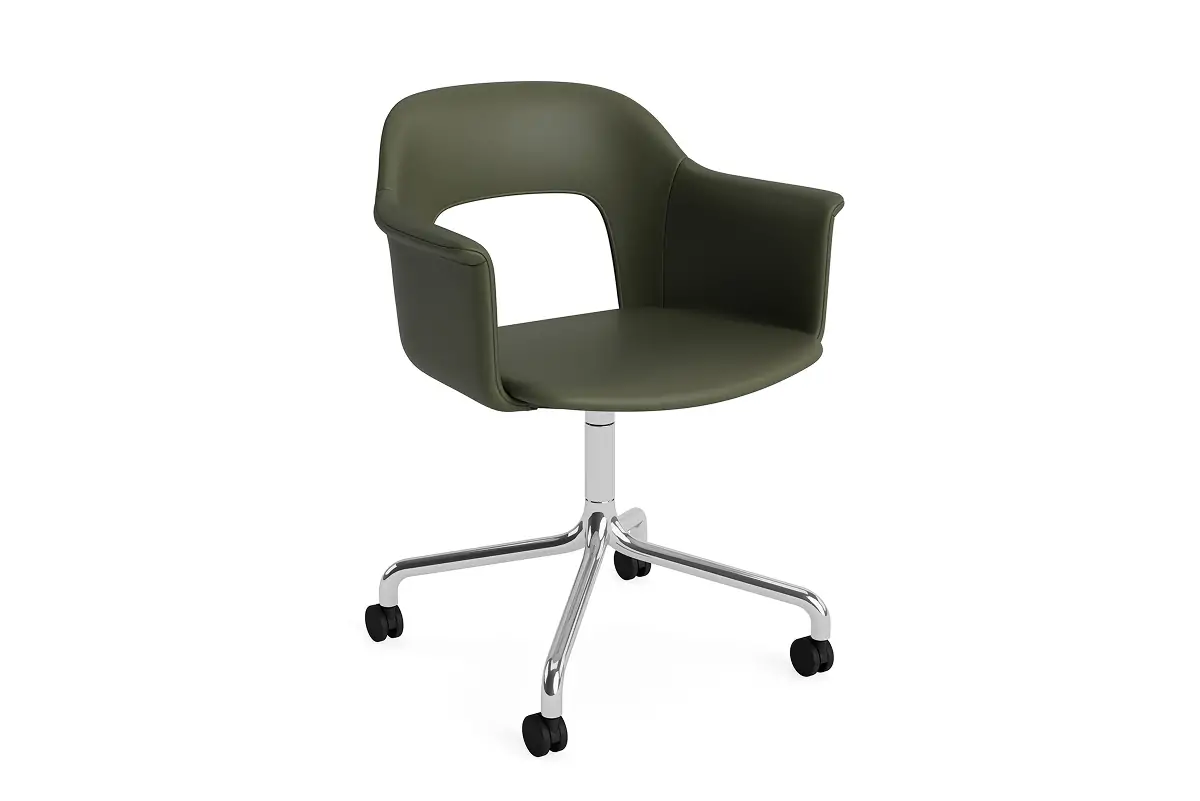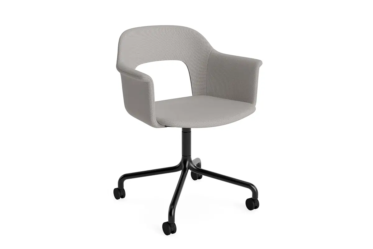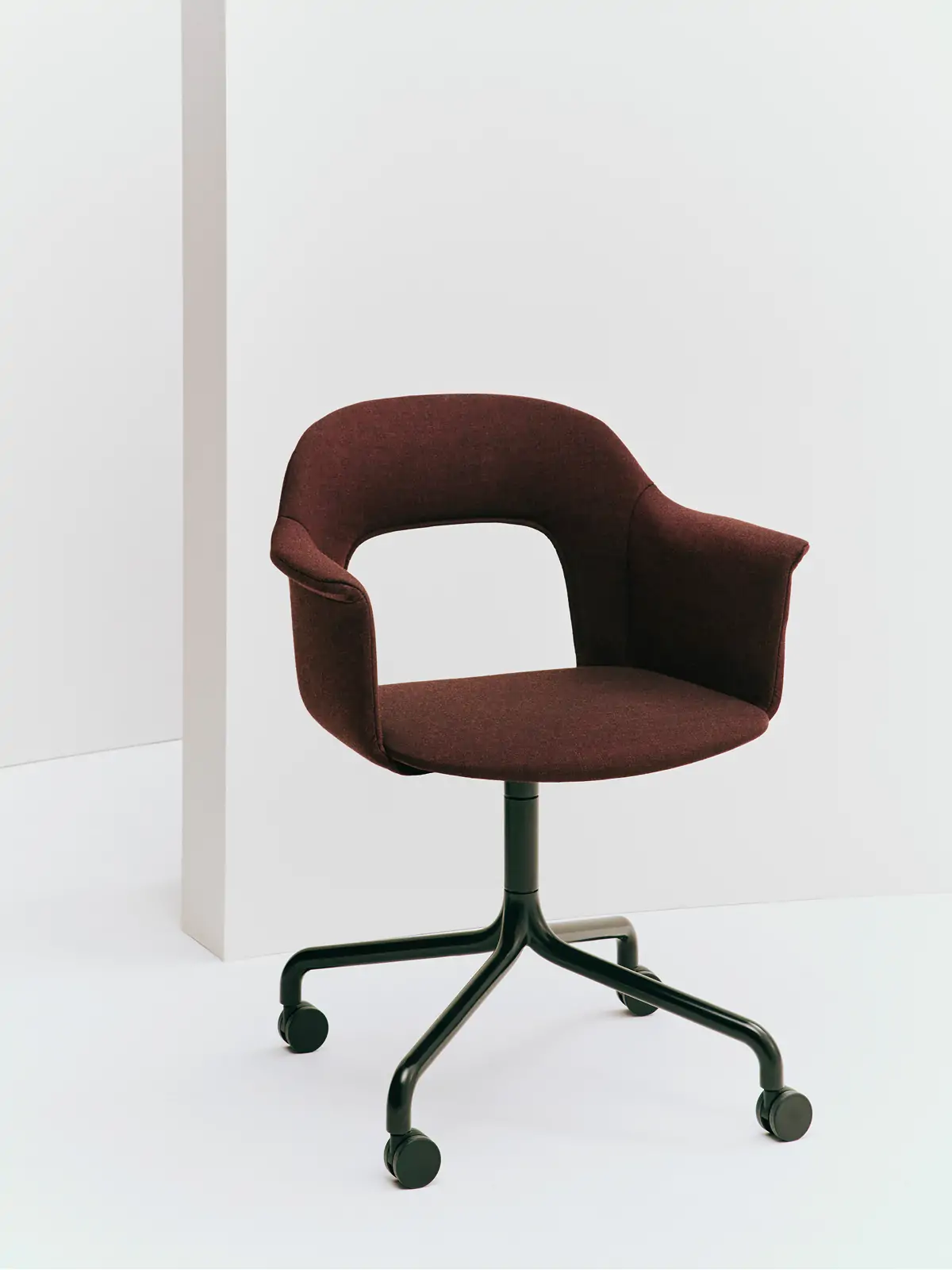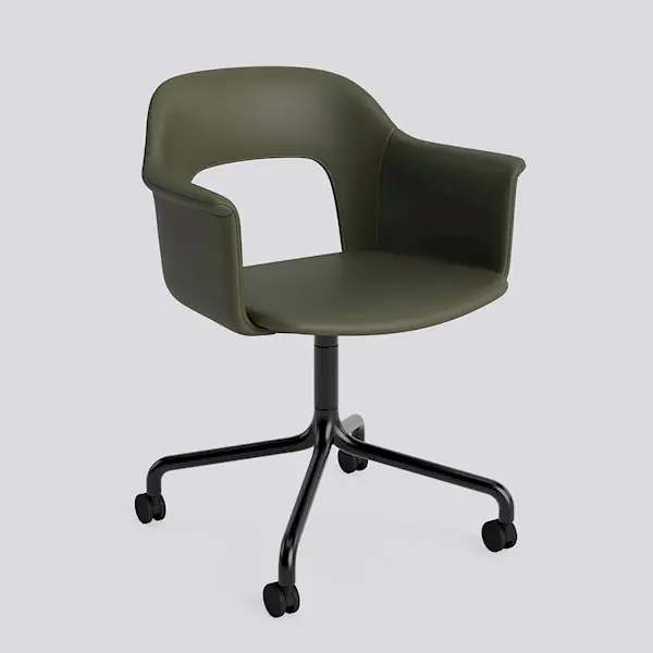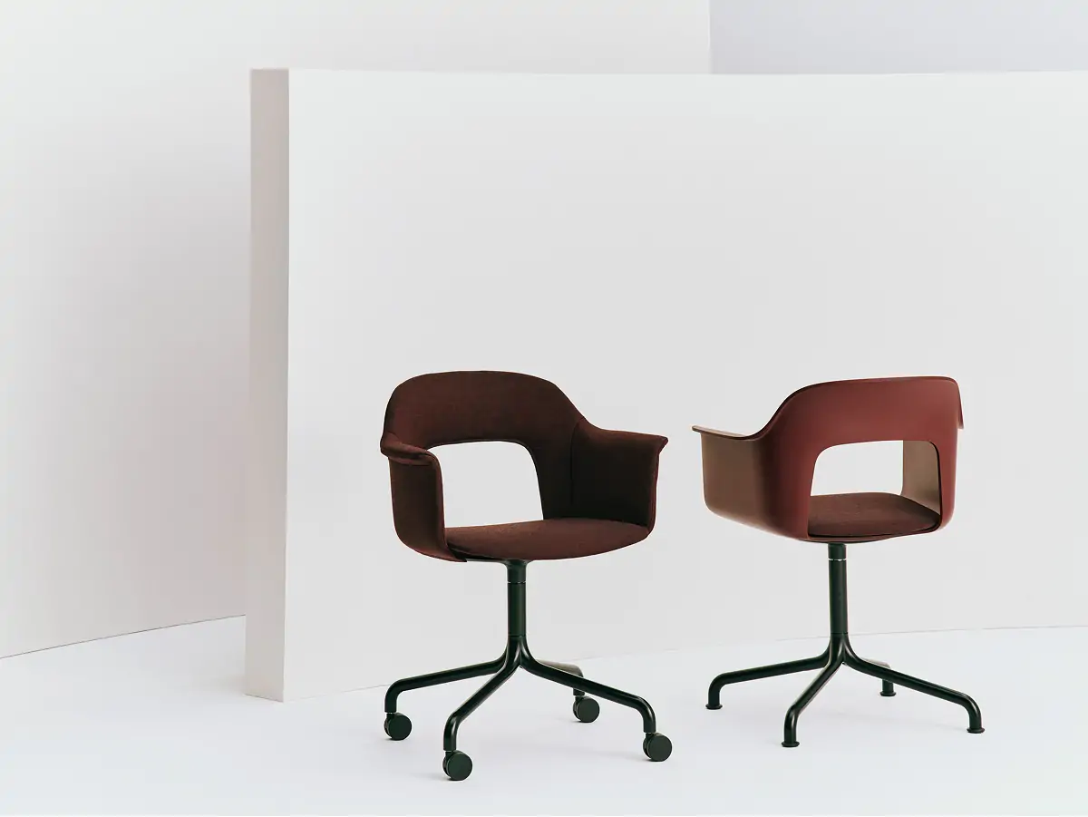 Designed by Julien Renault, Layout Armchair 264 offers a flexible and innovative design shaped by a commitment to comfort, functionality, and circularity. Characterised by the opening in the backrest, this defining feature provides greater comfort while giving its appearance a sense of lightness and transparency. Featuring an upholstered seat and back for a warm, inviting expression and an aluminium swivel four-star arc base with castors that balances elegant aesthetics and ease of movement, all chair components can be fully disassembled to extend its lifespan and enable refurbishment for long-term use. The shell is crafted from a minimum of 96% post-consumer recycled plastic, with the upholstered seat and back available in a variety of fabrics and olive-leaf tanned leather options, making Layout a versatile and durable seating solution ideal for most corporate settings and domestic