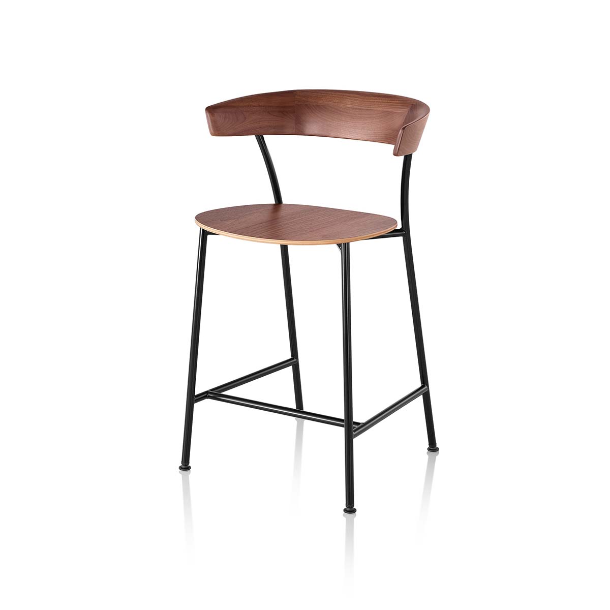 Like the Leeway Chair, Leeway Stools maximize freedom of movement within a minimal footprint. The curved, cantilevered backrest follows the shape of the human body and contributes to an open design that accommodates the side-to-side movements seated people make while socializing or collaborating.