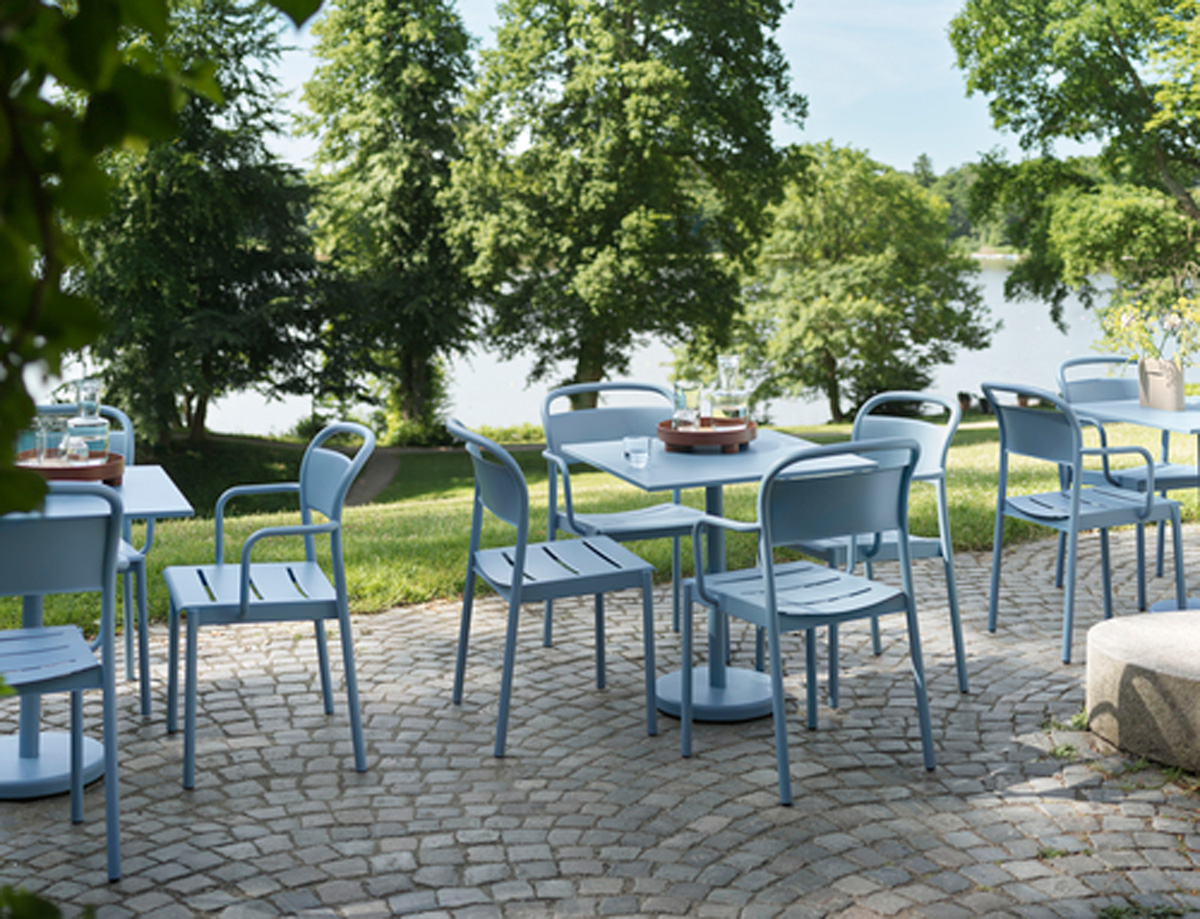 The Linear Steel Series was designed from the idea of presenting durable materials in a sophisticated and understated expression for outdoor use with its form language inspired by the notion of meetings—the meetings of lines, the meetings of shapes and the meetings of materials. The design is defined by its straight lines for a contemporary yet timeless aesthetic through the details of its folded edges, half-circular intersecting legs and small spacing for easy outflow of water. It is through these subtle elements that the Linear Steel Series translates the values of elegance, longevity and functionality into modern outdoor furniture.