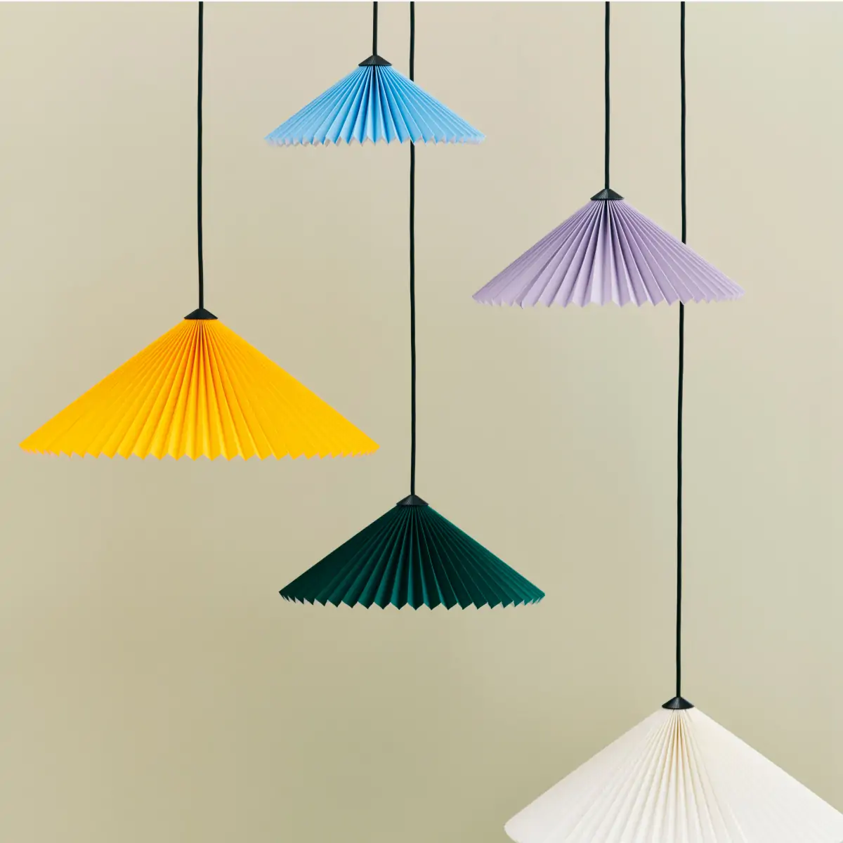 The Matin Pendant Lamp comprises a pleated cotton shade combined with a cotton braided cord that can be hung from the ceiling to create a functional and elegant pendant lamp. The shade brings an inviting atmosphere to most rooms in the home and comes in different size and colour options.