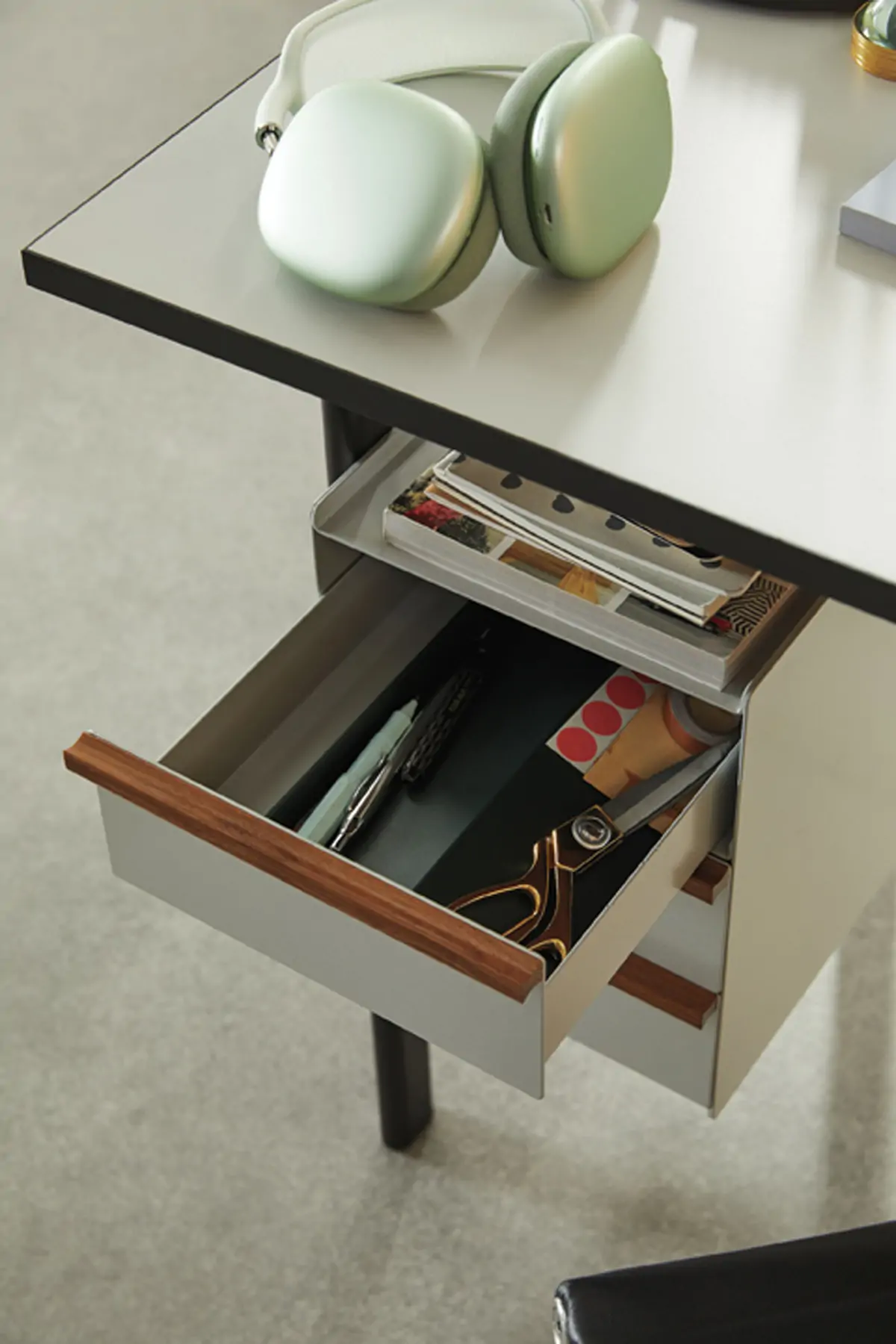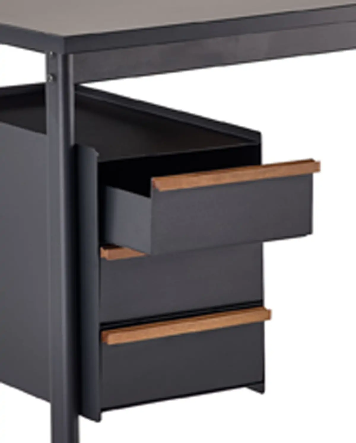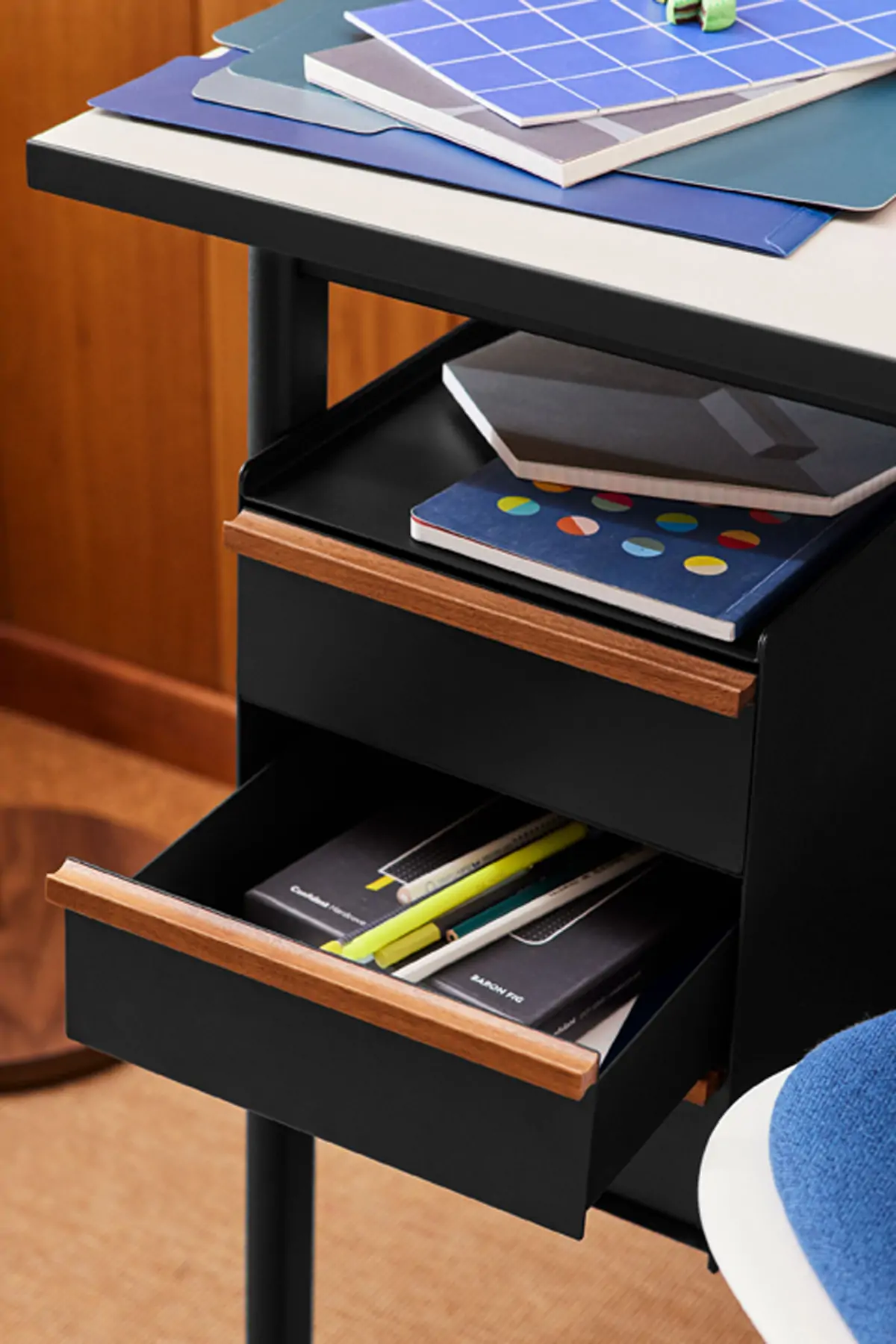 Make it your own with multiple color and material options for the desk’s top, drawers, and handle finishes. Choose earthy neutrals to complement any space or add wood handles for a warm touch to the steel drawer cabinet.