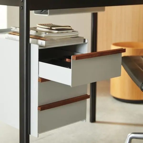 Make it your own with multiple color and material options for the desk’s top, drawers, and handle finishes. Choose earthy neutrals to complement any space or add wood handles for a warm touch to the steel drawer cabinet.