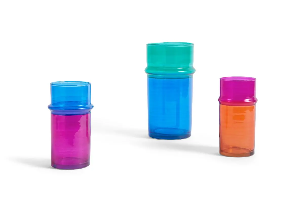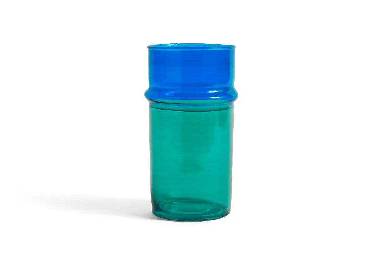 Hand-blown in Morocco, these painted glass vases are an easy way to add a pop of colour to a room. Crafted from recycled glass, they are available in different sizes in a variety of monocoloured or colour-blocked designs.