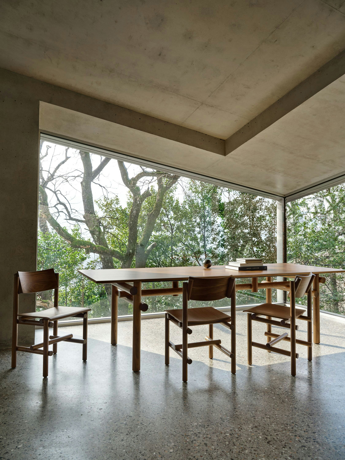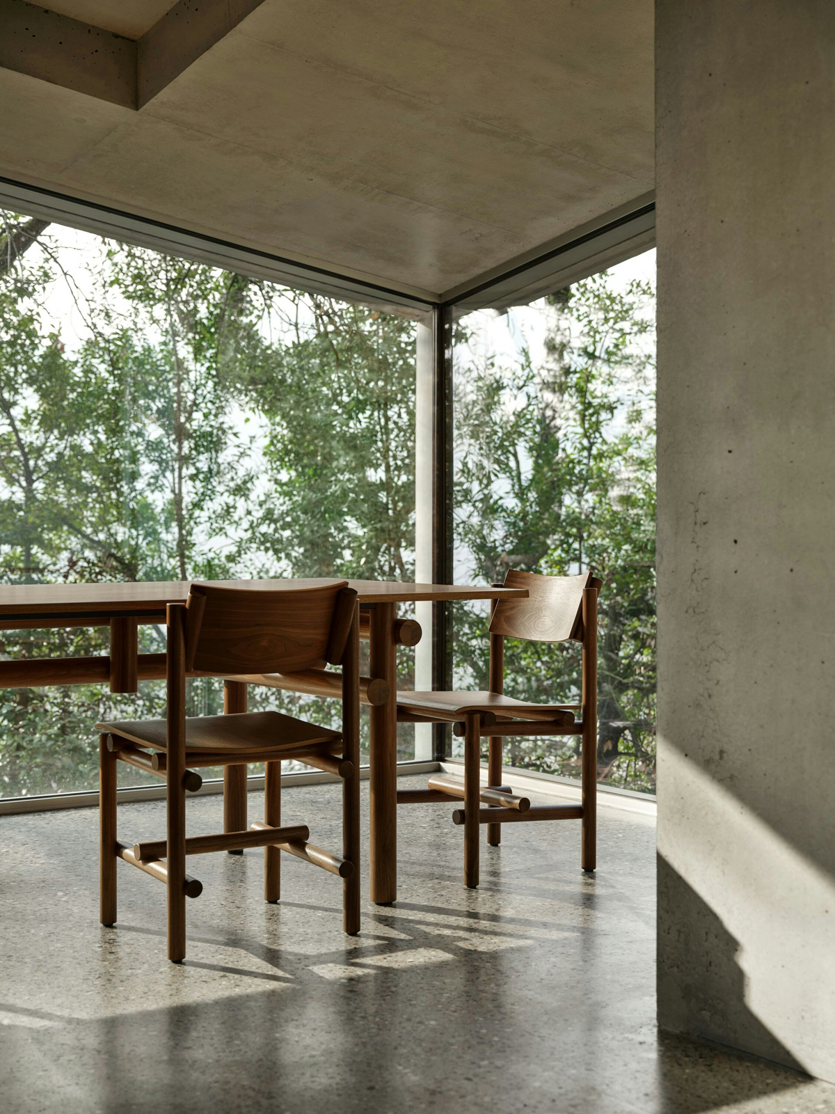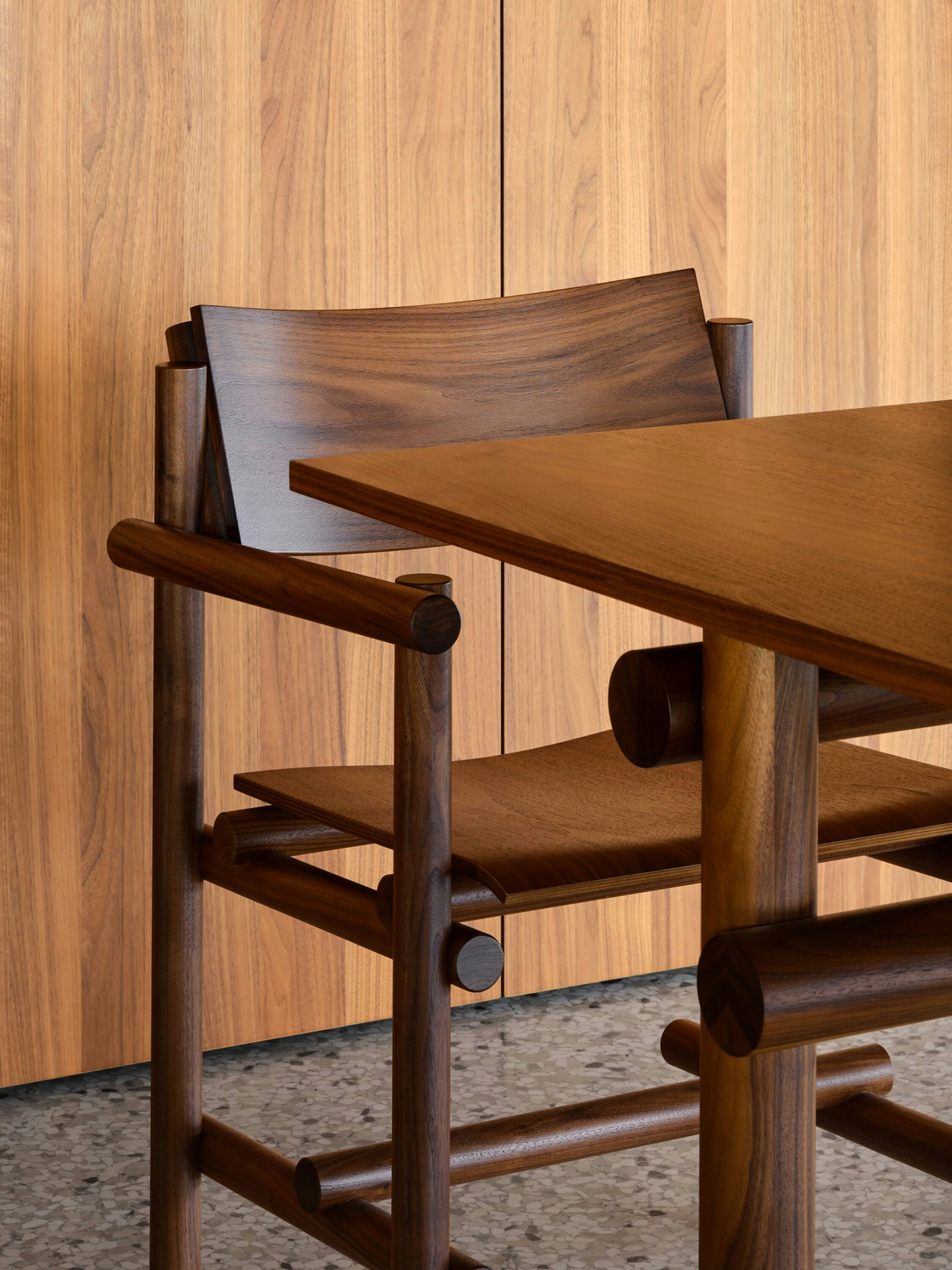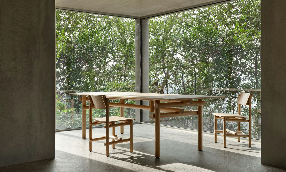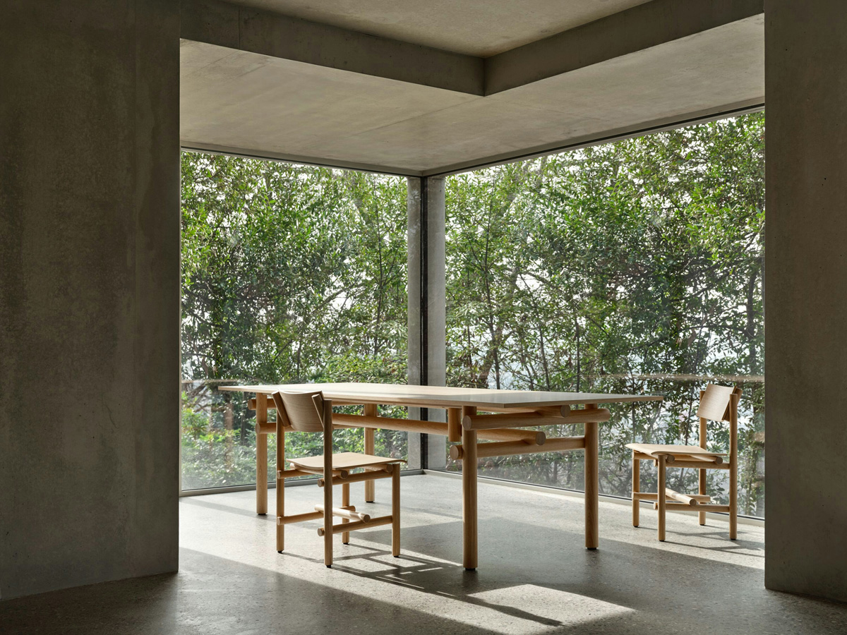 Jonathan Muecke produced an extensive series of hand-built prototypes to develop the collection’s distinct joinery, which he then repeated across the collection. Here and in his art practice, Muecke explores the stabilizing effects of repetition. A note on his studio desk reads: Repetition allows an object to be found in as few decisions as possible. He explains, “It’s a preference for a certain type of object—one that isn’t a thousand decisions, but three.”