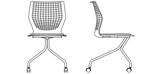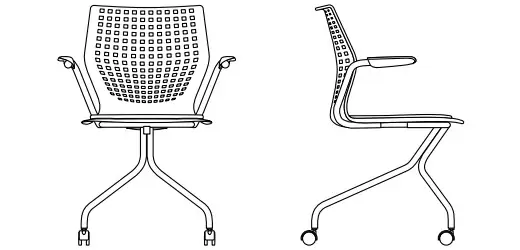 The optional hybrid base for MultiGeneration is a unique design solution that combines the comfort of a cantilever form with a sturdy four-leg construction, giving the option of mobility from casters and freeing up the front corners for various postures. Cantilevered chairs have dynamic frames that respond to a user’s weight, but typically they cannot accommodate casters, which are desirable in a multipurpose chair, nor do they have front leg structures that can limit the user’s leg movement. Four-leg chairs are sturdy and allow for casters, but they don’t have a dynamic frame. Formway selected the most desirable attributes of the traditional base types to create the MultiGeneration hybrid base, a melding of cantilever and four-leg constructions.