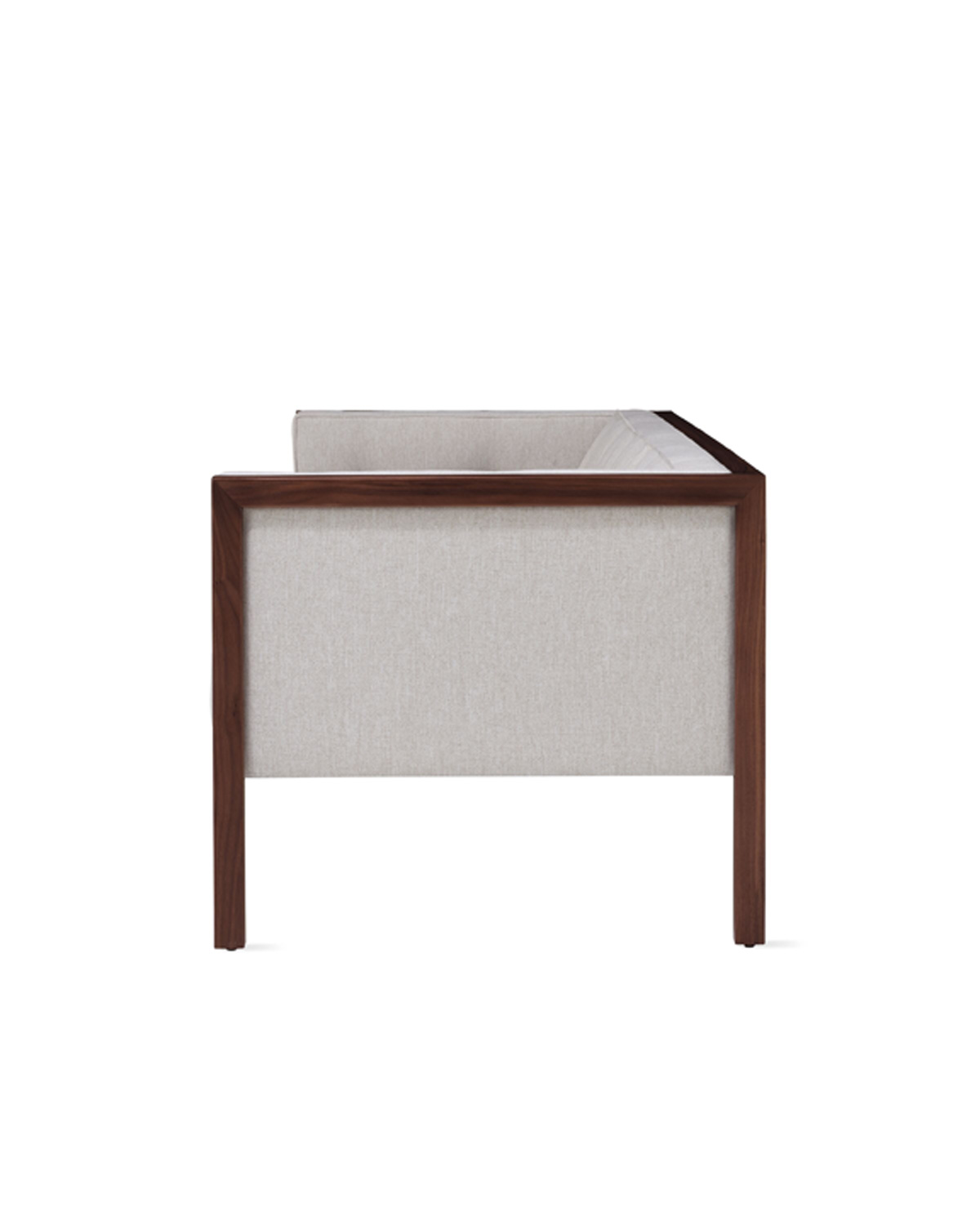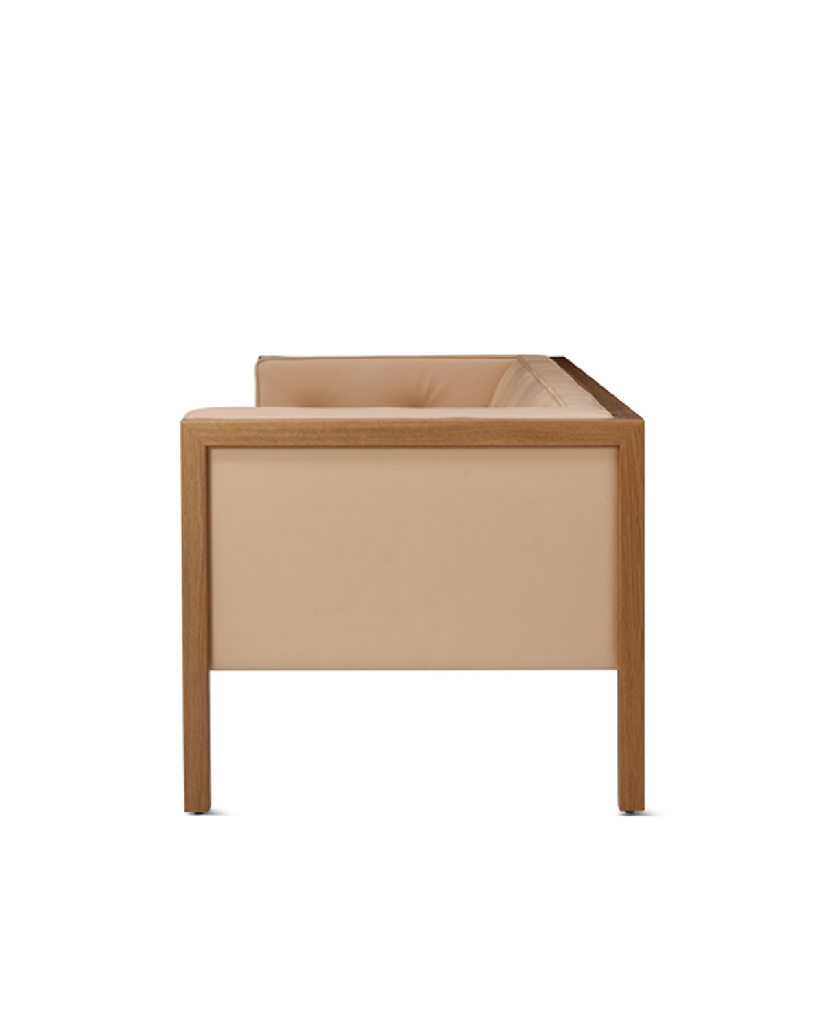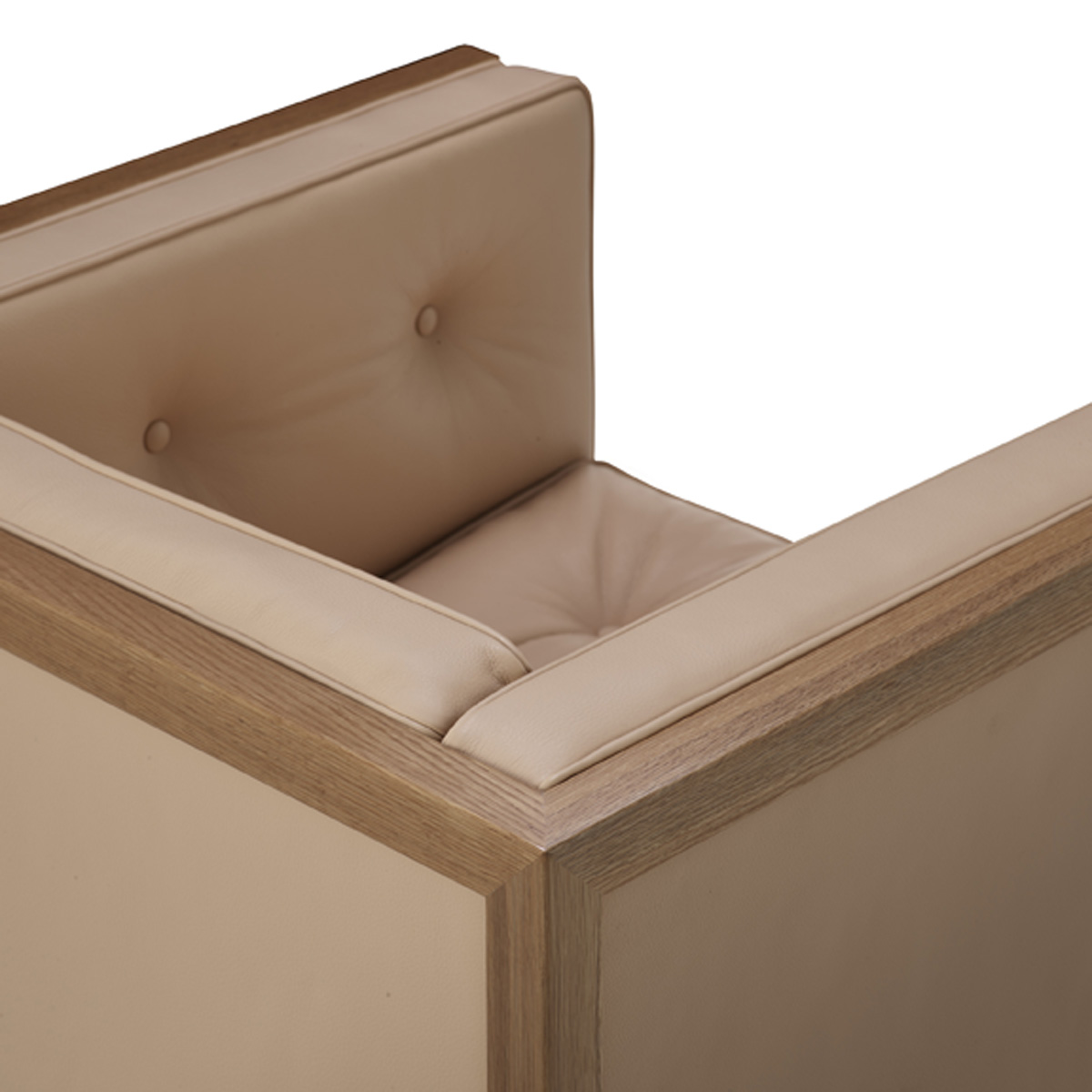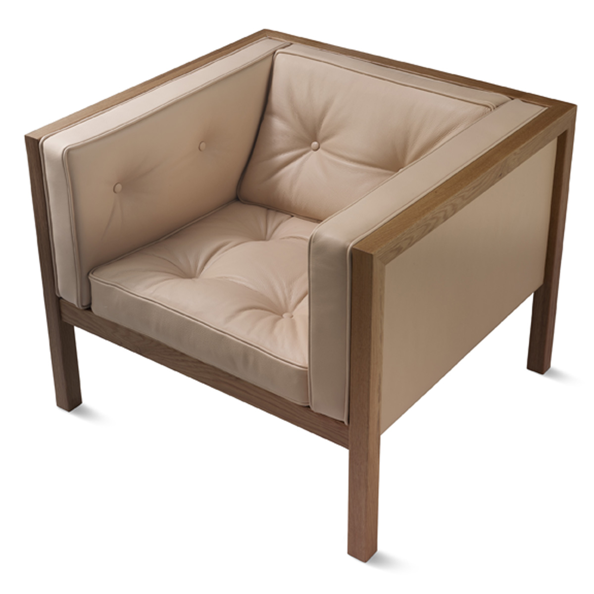 Nelson’s design juxtaposes the firm lines of the wooden frame with pliable seating and a gently angled seatback for an armchair that provides an equal measure of give and support. Its square cushions are tufted and framed with piping, adding warmth and visual variety.