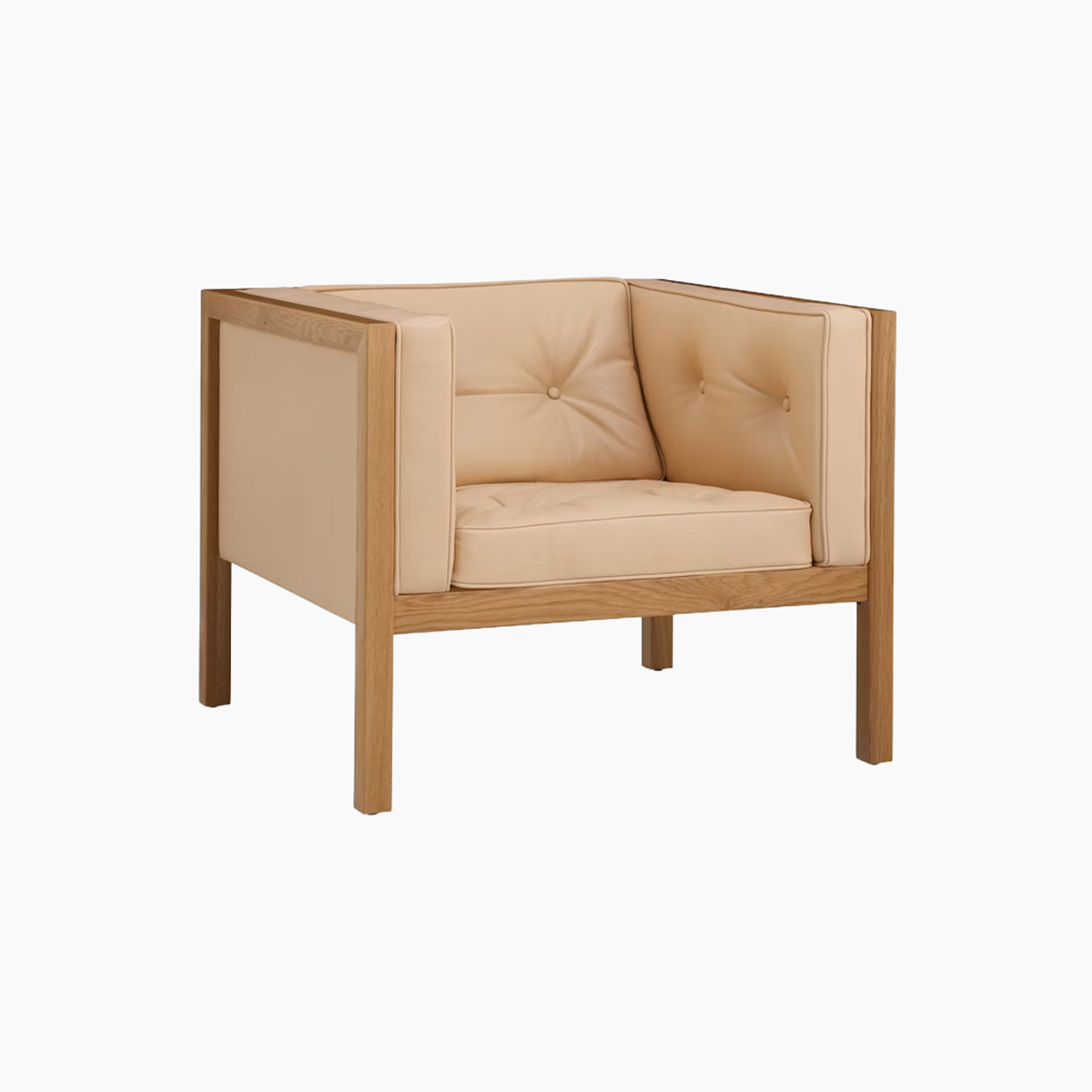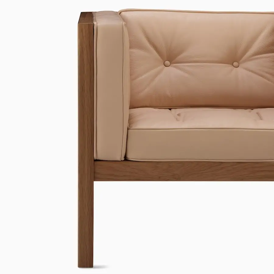 Nelson’s design juxtaposes the firm lines of the wooden frame with pliable seating and a gently angled seatback for an armchair that provides an equal measure of give and support. Its square cushions are tufted and framed with piping, adding warmth and visual variety.