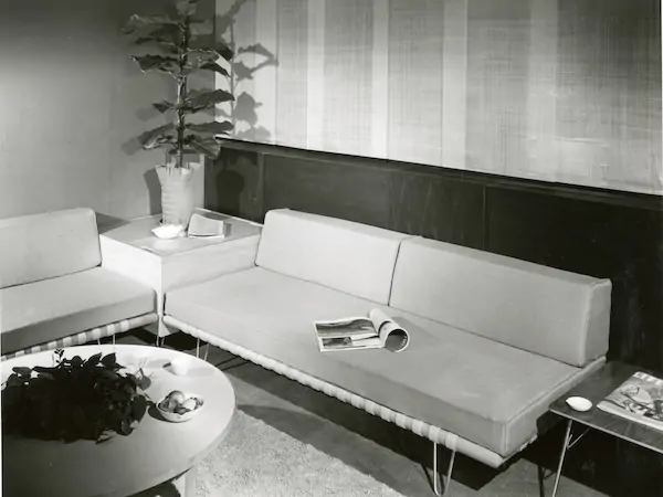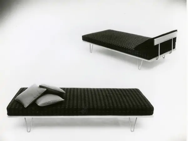 Nelson designed an early version of the Daybed for his own use in 1941, then refined the original design and launched it in 1949. Nelson advocated that design should evolve as human behavior changed. In his ideal interior space, furniture was designed to be in relation to the whole. With flexibility inherent in its form and use, the Nelson Daybed exemplifies this philosophy. As an archival advertisement points out, the Nelson Daybed is “ideal for the bedroom that has to double as a sitting room.”