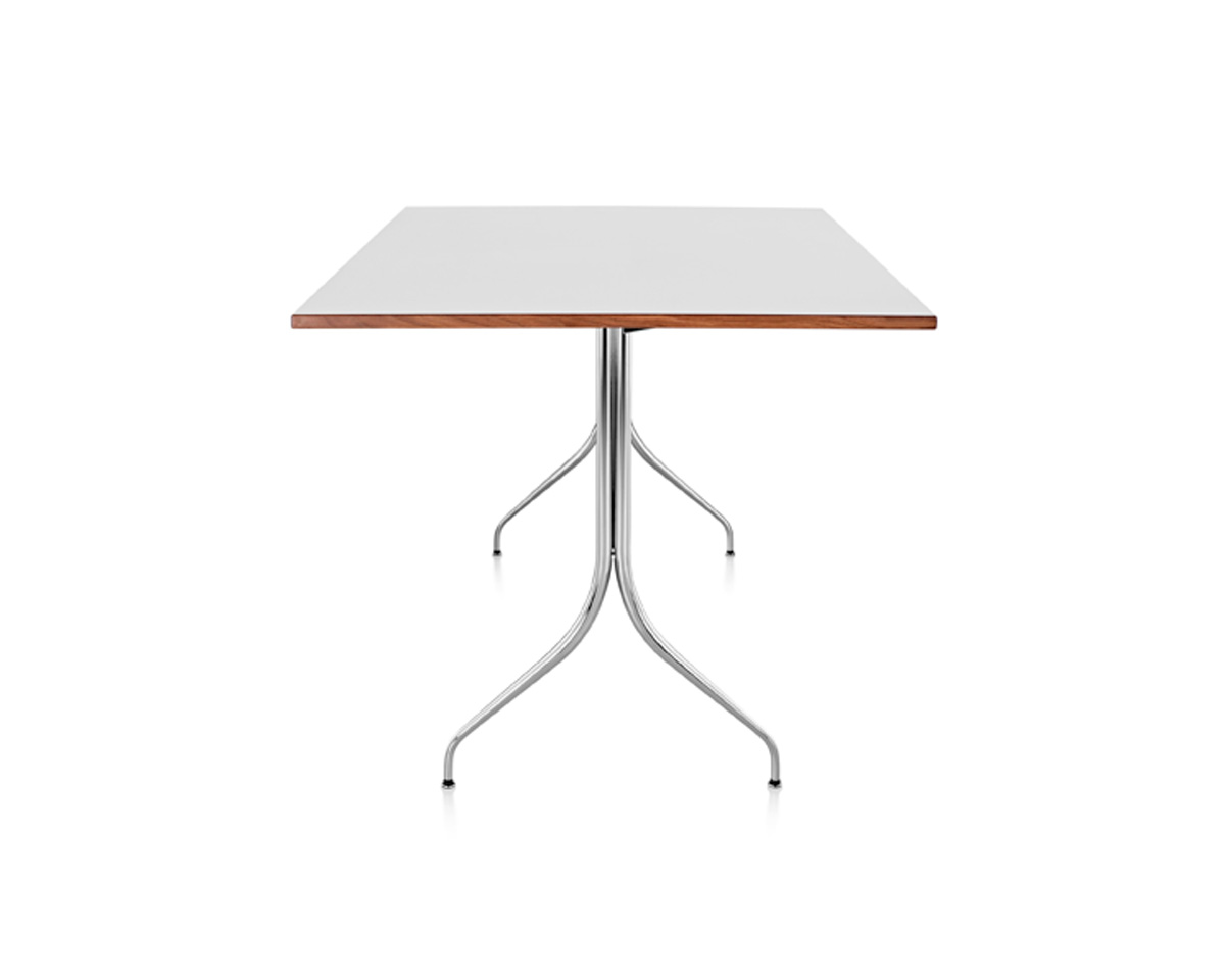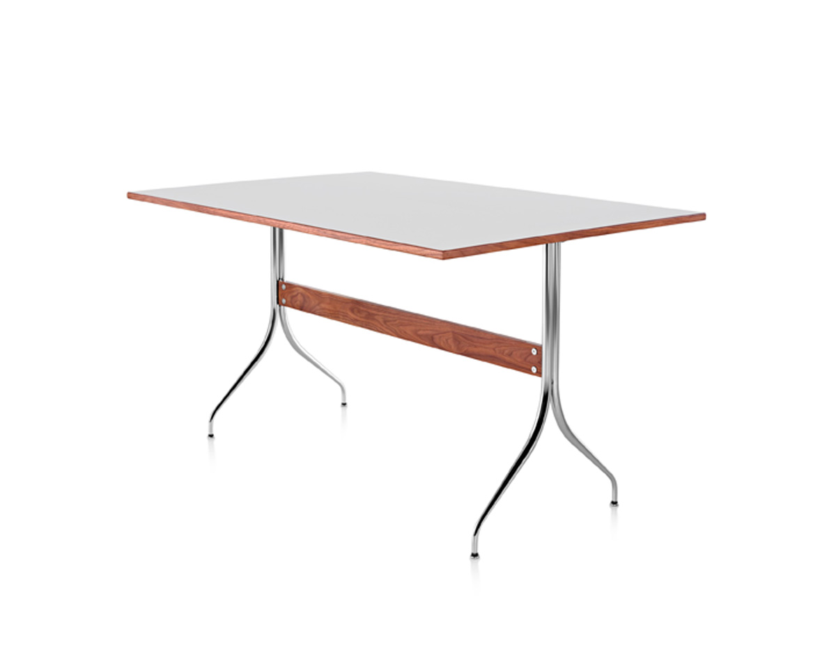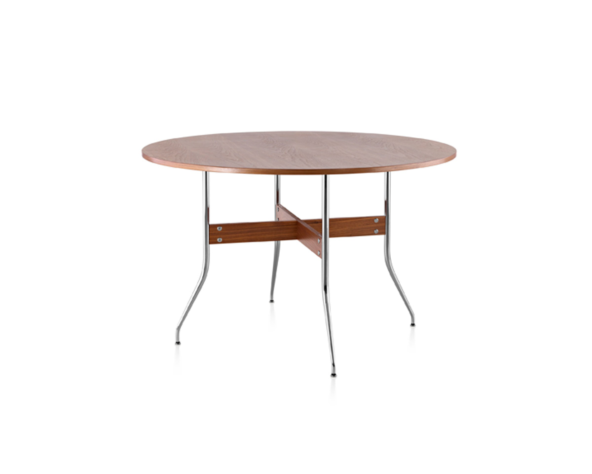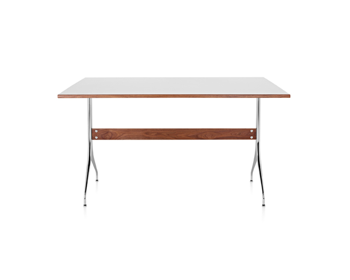The Nelson Swag Leg Table from Herman Miller uses a process called “swagging” to produce tapered and curved metal legs, creating a sturdy base. The Swag Leg Table comes with the option of a round or rectangular tabletop that can be used in office or hospitality settings. All Nelson Swag Leg tables include chrome bases and adjustable glides to adapt to your space’s needs.