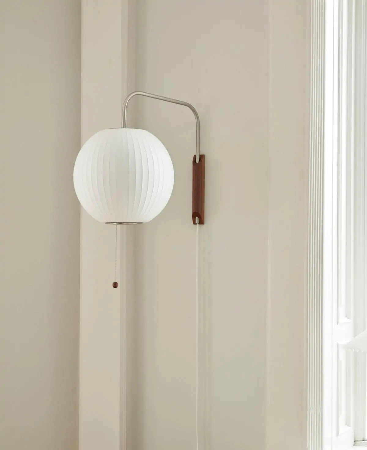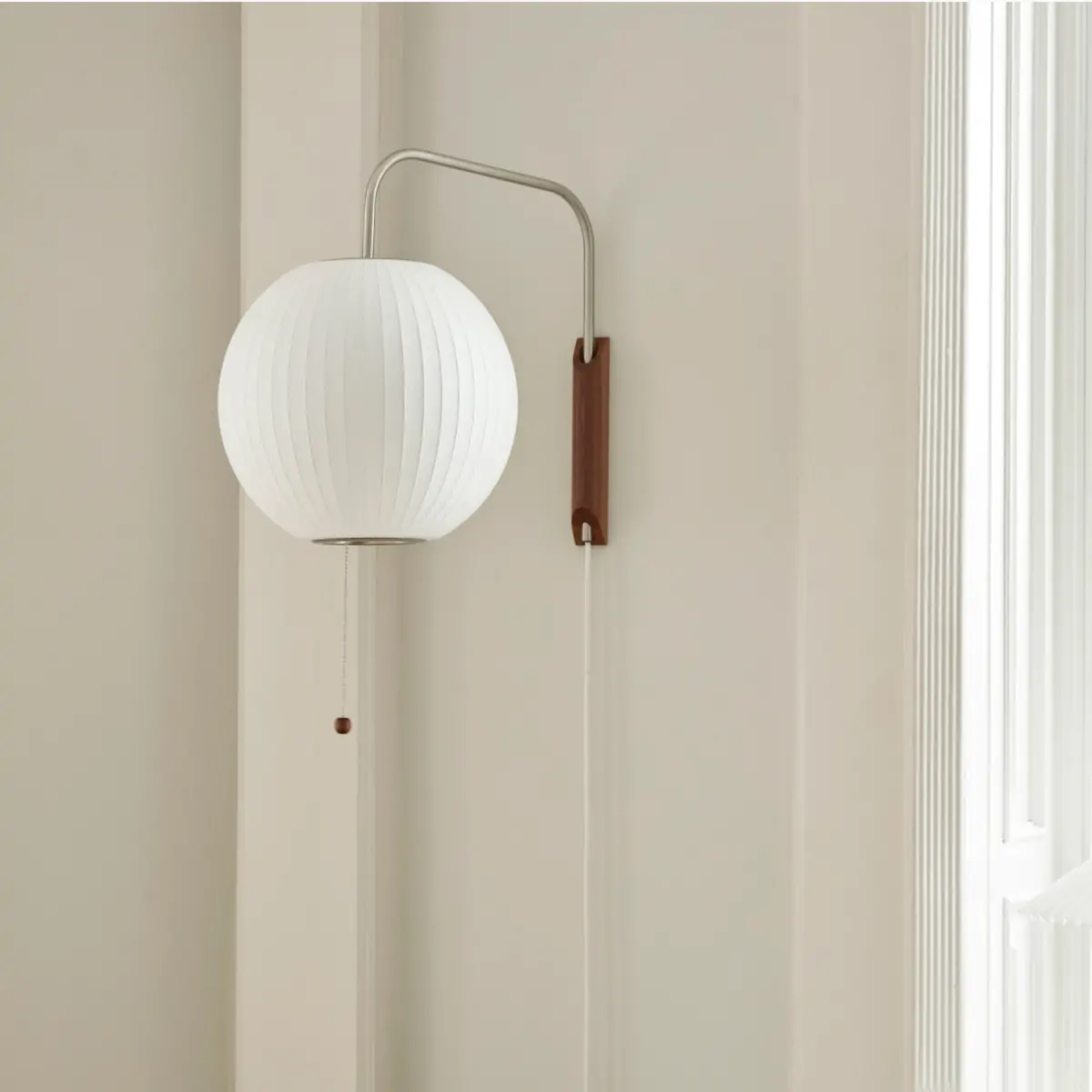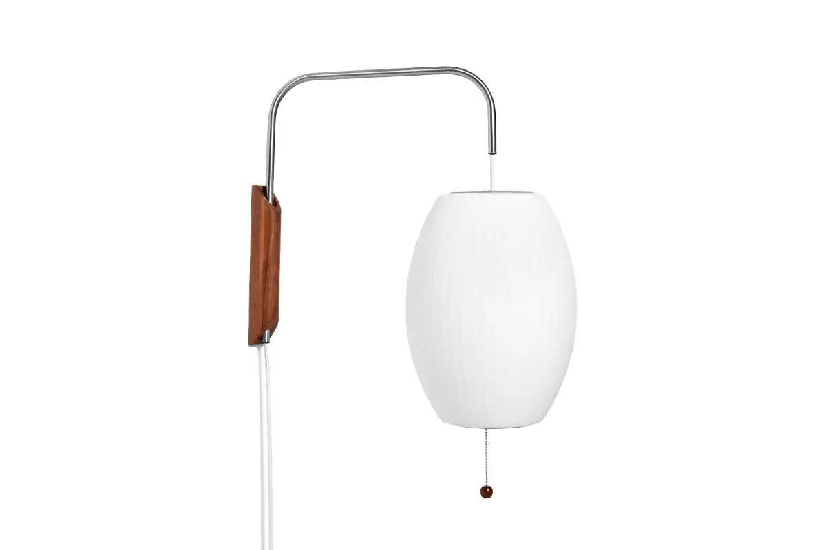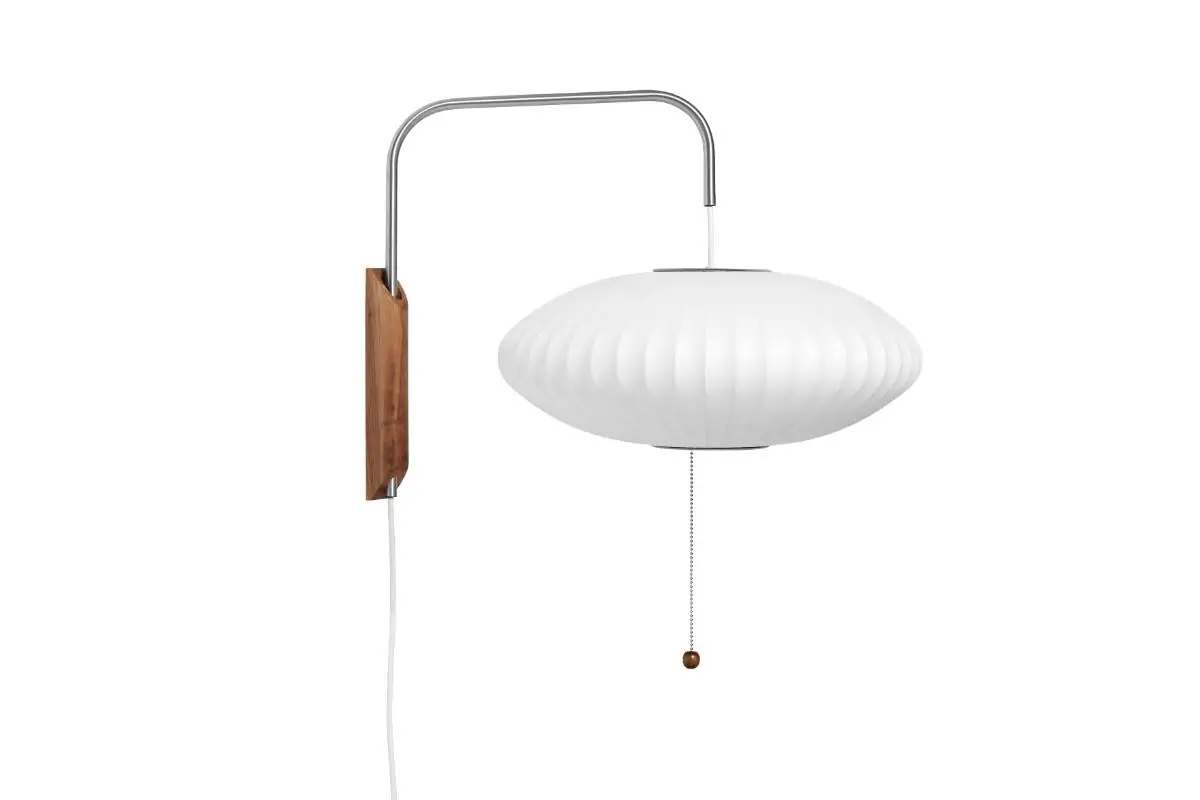 Part of the Nelson Bubble Lamp series, the Nelson Wall Lamp series comprises a range of wall-mounted lighting solutions. Featuring a spherical shade suspended from a walnut wall mount and steel arm, the lamp fills any interior with a warm, diffused light. The lamp’s arm can be adjusted from left to right and up and down without having to change its position on the wall. Available in Ball, Pear, Cigar, and Saucer variants.