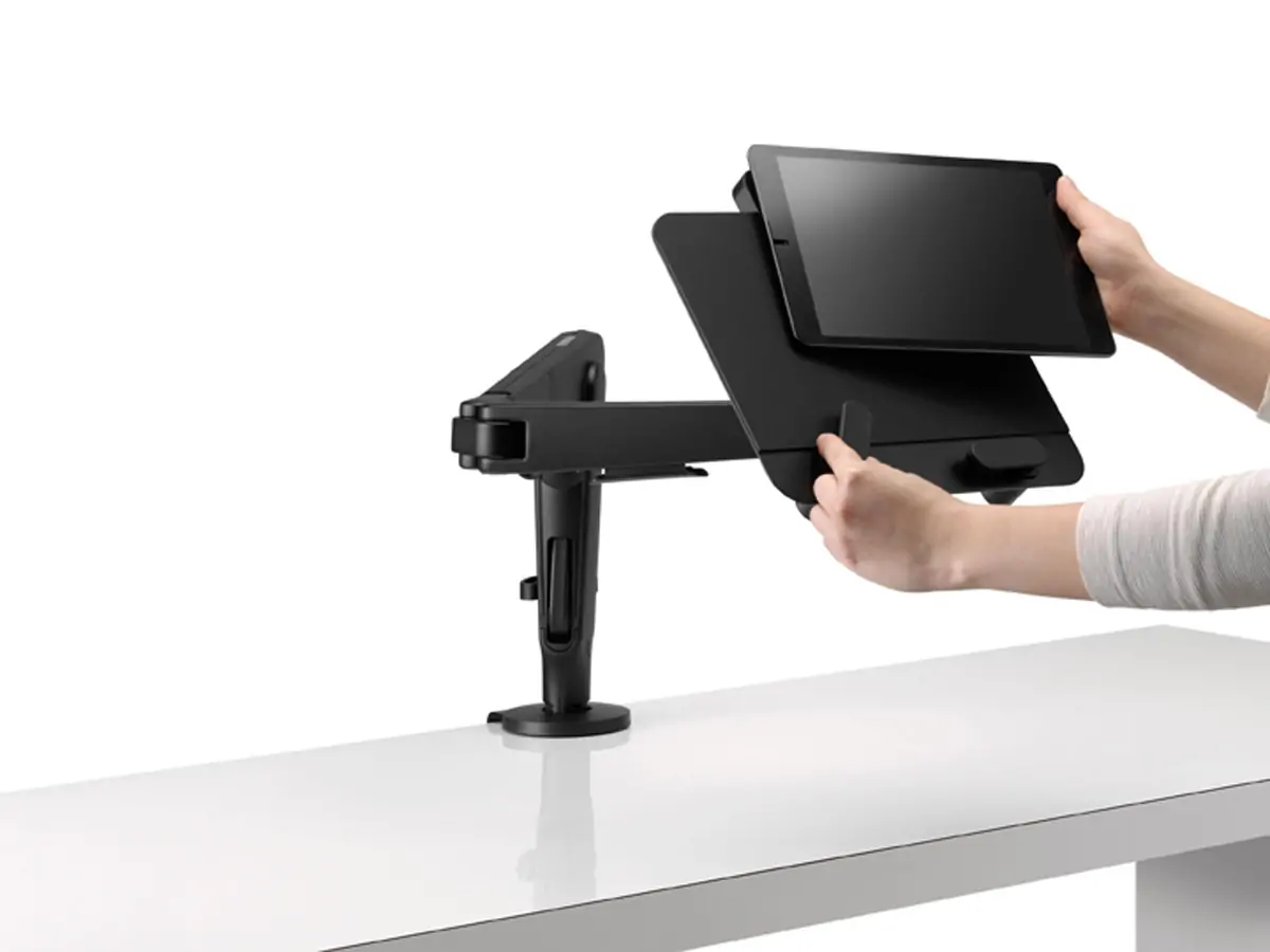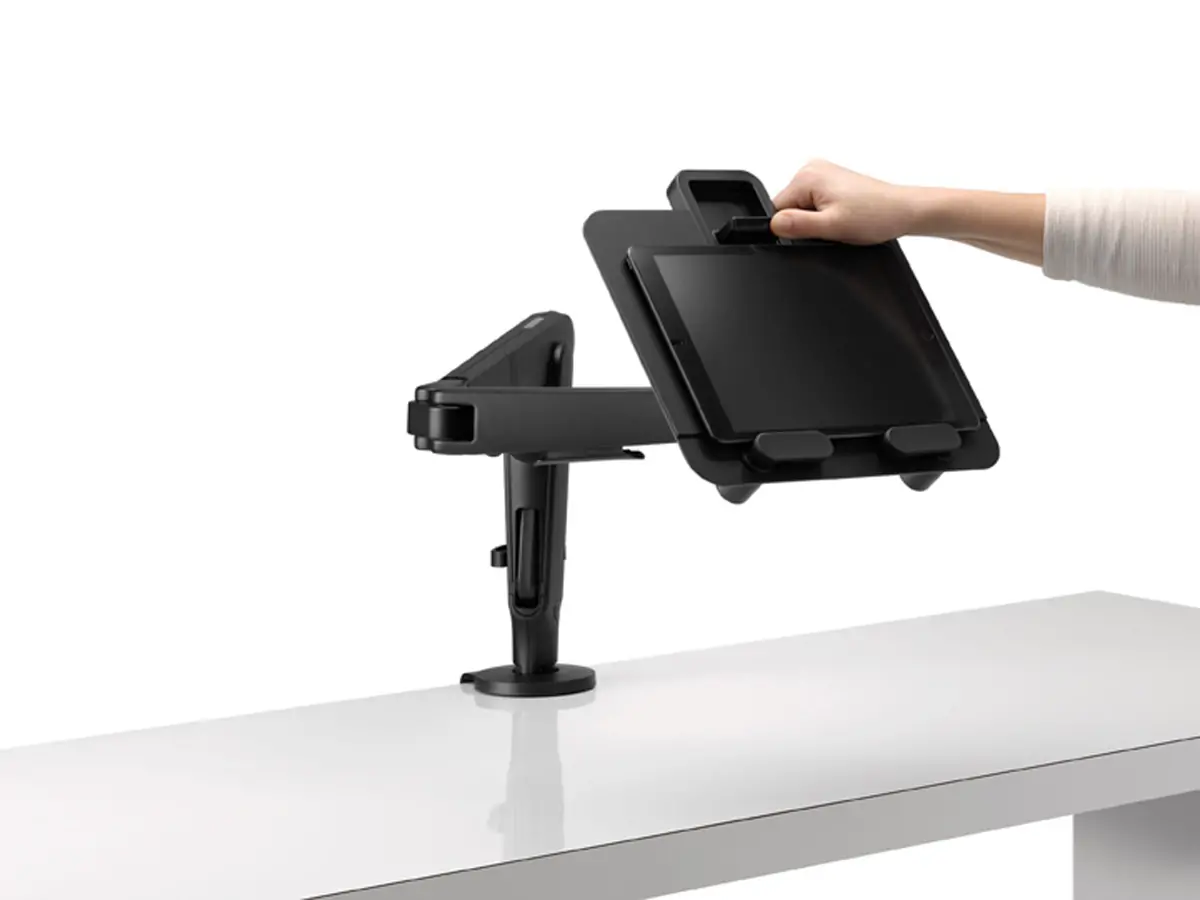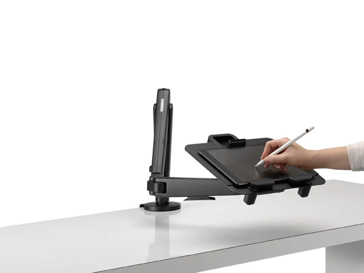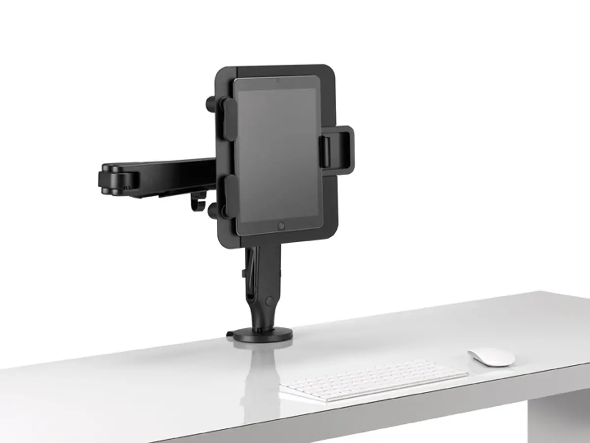 The mount securely holds tablets from 9.7 inches to 13 inches (243 to 330mm), and any laptop weighing up to 6.1 pounds (2.8kg).