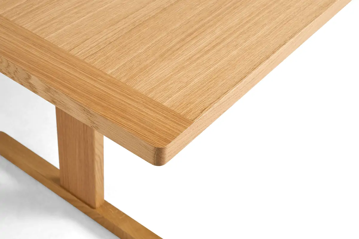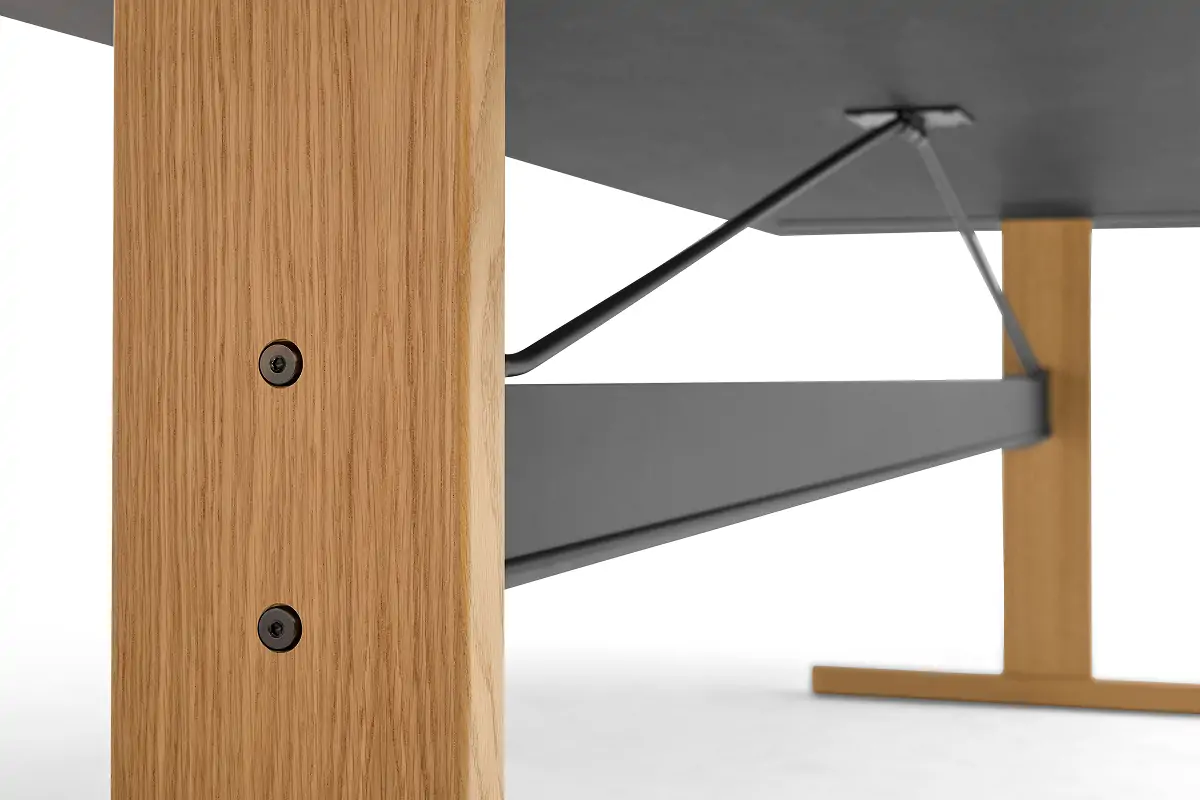 Inspired by the uncluttered aesthetics of classic Shaker furniture, French designers Ronan and Erwan Bouroullec designed the Passerelle Table – an updated interpretation sharing the same simplicity and quality in a more contemporary context. With a well-balanced, flat-packed construction, the tabletop features solid wooden edges and top surface in veneer or linoleum, with the core made of Lisocore® – an advanced, high-quality material that offers great strength yet is extremely light and easy to move around. The table frame is equally robust and functional, with solid wooden legs and aluminium and steel crossbar that strengthen and stabilise the table. The Passerelle Table’s variety of material, colour and size options amplify its multifunctional quality, making it suitable for using as a kitchen, dining table, or meeting table in both private and public spaces.