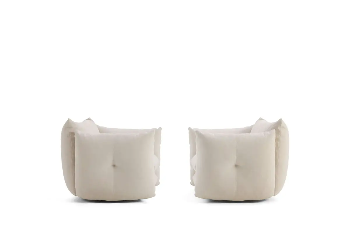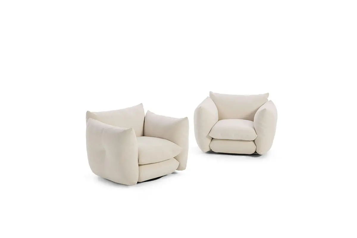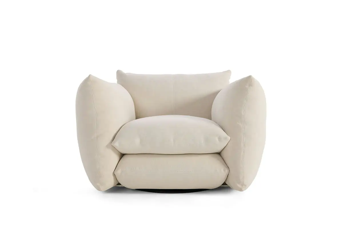 The Perron Pillo Lounge Chair—available with a swivel or fixed base—challenges preconceptions. What appears to be a freestanding stack of oversized pillows is, in fact, engineered to offer lounge-like support for relaxation and conversation. Surrounded by pillows, you forget the piece and simply enjoy the experience.