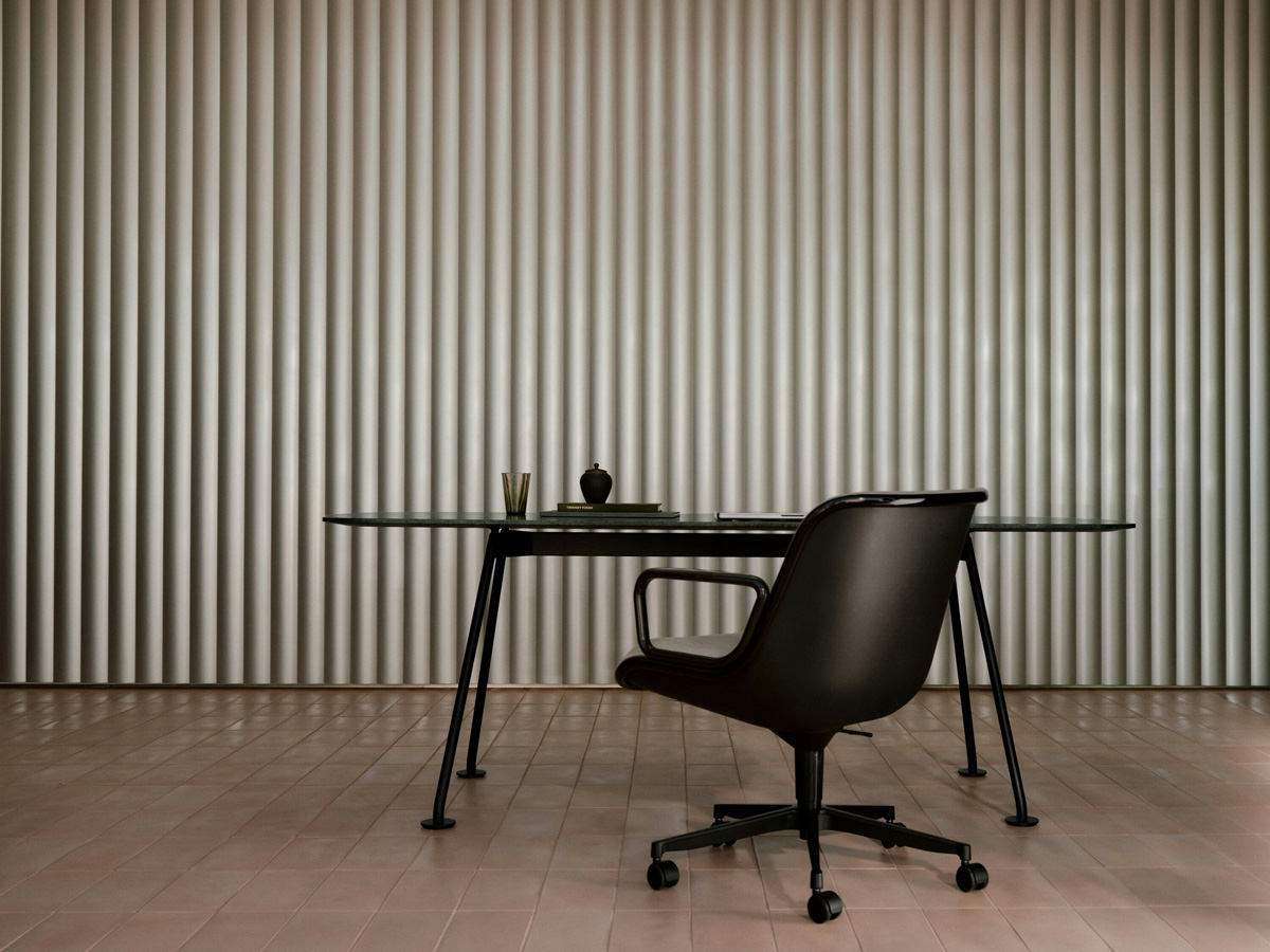 Pollock again demonstrated his command of line and material when he conceived the 1250 series executive collection, introduced in 1965. His idea for the chair was to use an aluminum “rim,” which outlined the chair as the main structural and design element. This rim would hold the parts together, without any further support; slots in the aluminum held the back shell and the upholstery in place, and the plastic back became rigid only after being fitted into the frame. The resulting design was an achievement in structure and aesthetics, and the chair remains a Knoll classic to this day.