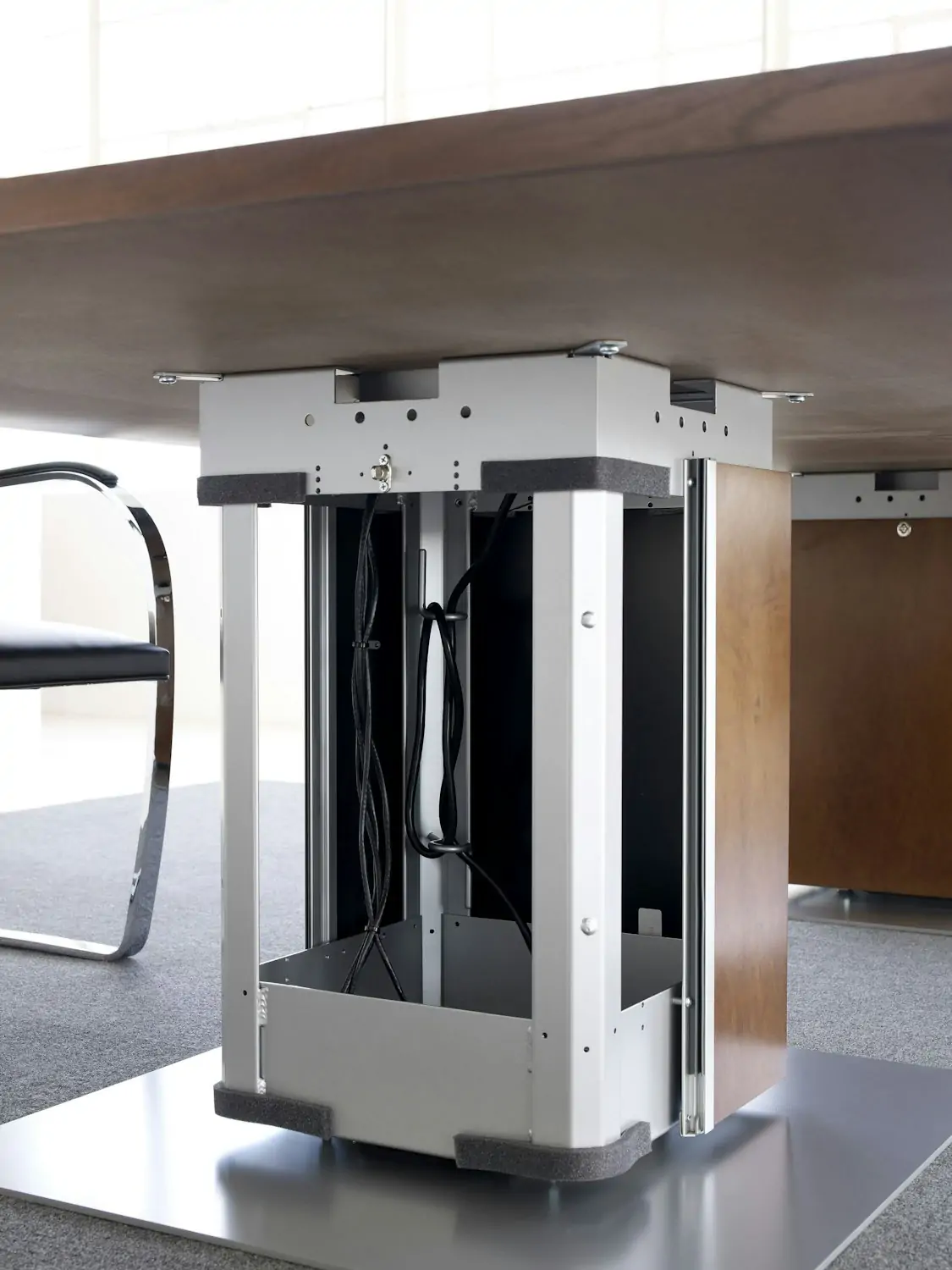 Elegant and simple solutions manage technology and electrical components. Wires and cables remain hidden within the different base options, but are easily accessible when needed.