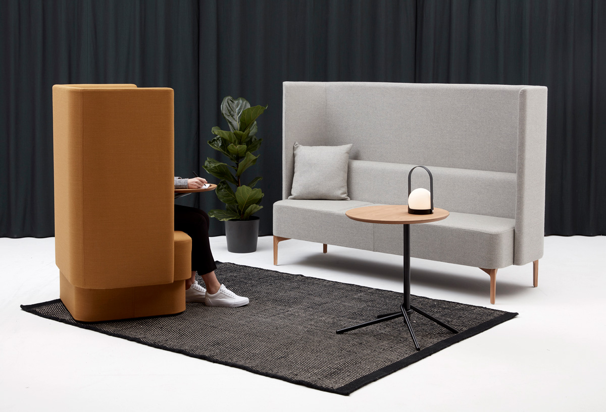 Like the intimate British railroad cars that inspired its name, the Pullman Sofa from NaughtOne features an enveloping design for acoustic privacy in bustling open office spaces. This sofa includes a high back and sound-absorbing upholstery to support focused work or private conversations. It’s available in two- and three-seat versions, each with the ability to add small tablet desks that can comfortably fit laptops. The Pullman Sofa can be further customized with power integration and comes in a range of fabrics and leg finishes. It pairs well with other products in the Pullman family.