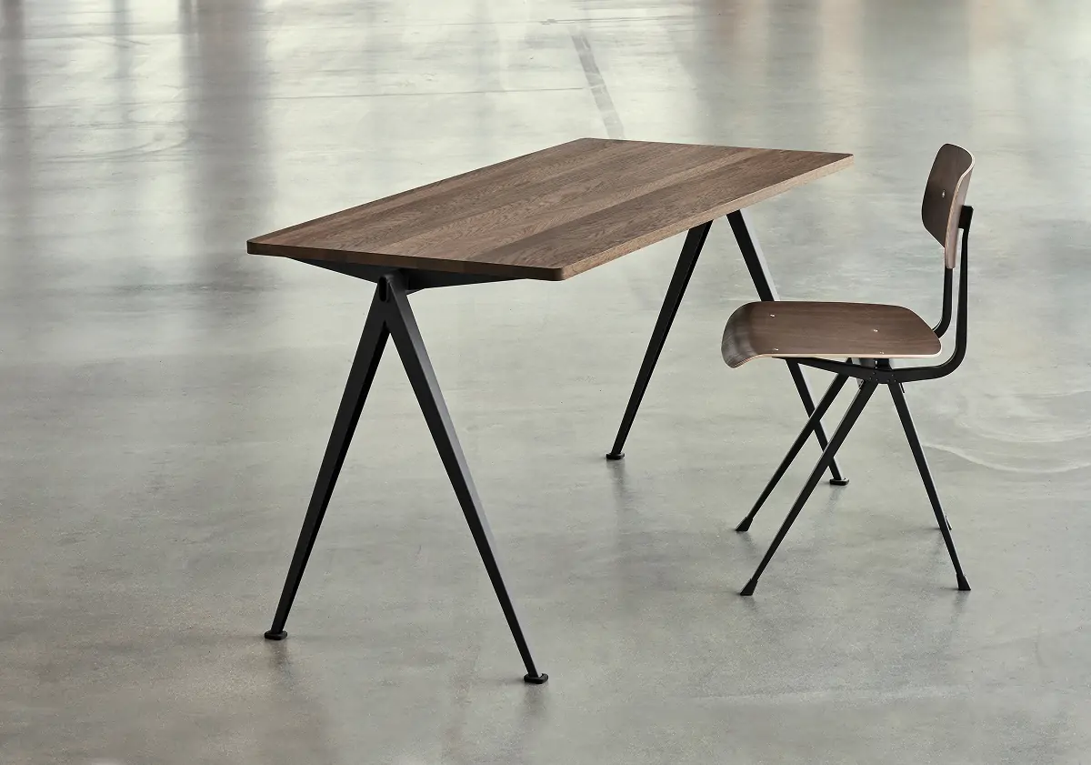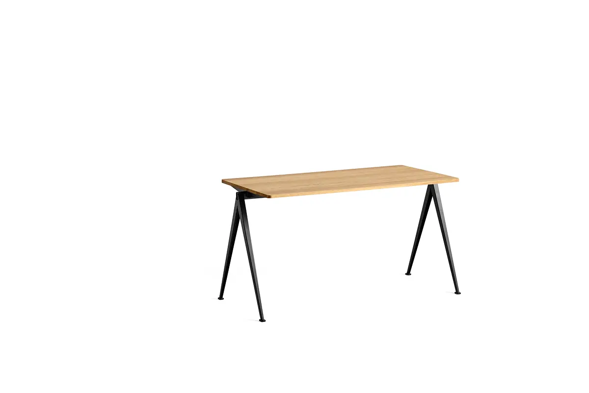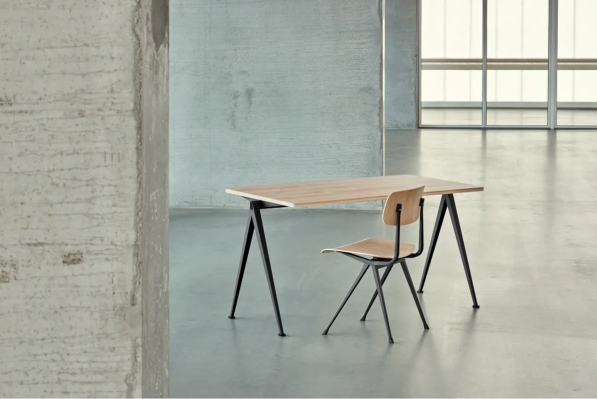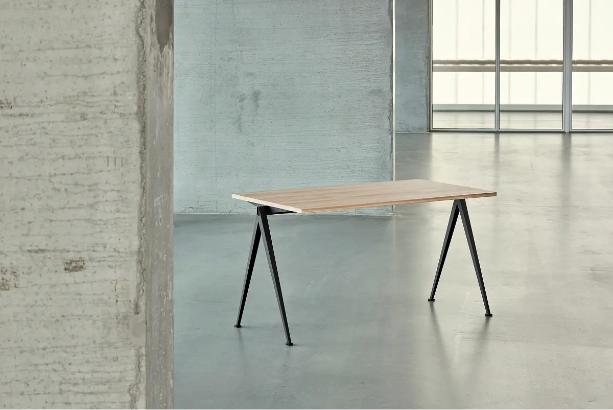 Designed to be functional, light and strong, the Pyramid Table features a steel-sheet base with a rectangular oak tabletop. Originally created by Wim Rietveld while working at Ahrend in the 1950s, the cutout steel collection has been relaunched by HAY together with Ahrend. The table comes in two models – with and without overhang – and is suitable for using in a wide range of educational institutions, corporate environments and private homes. Both variants are available in a variety of wood finishes and base colours that can be coordinated with the Result Chair and the Pyramid Bench.