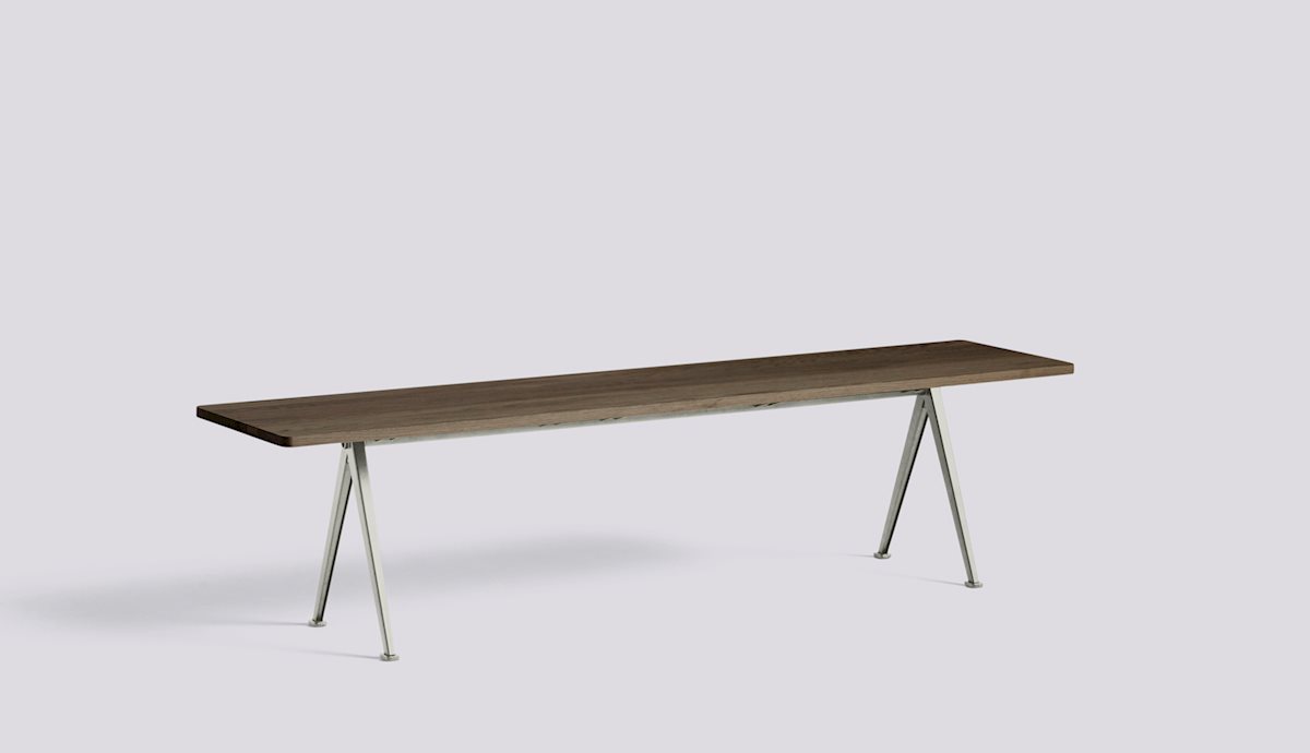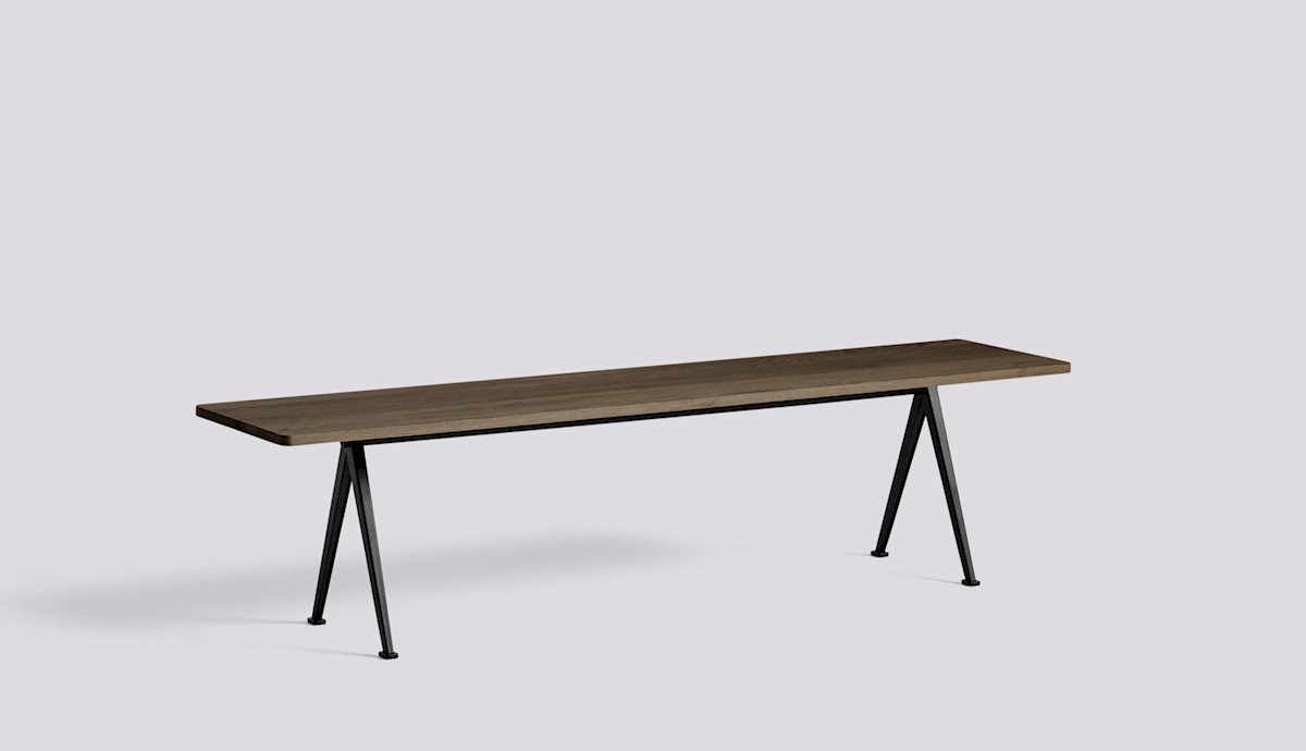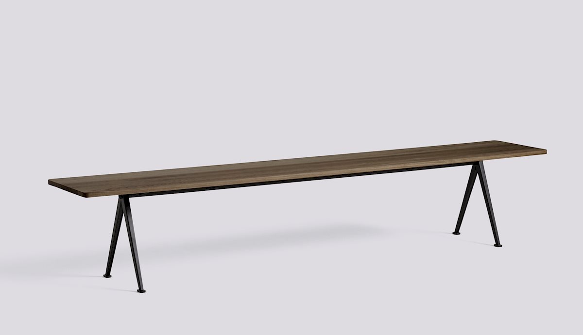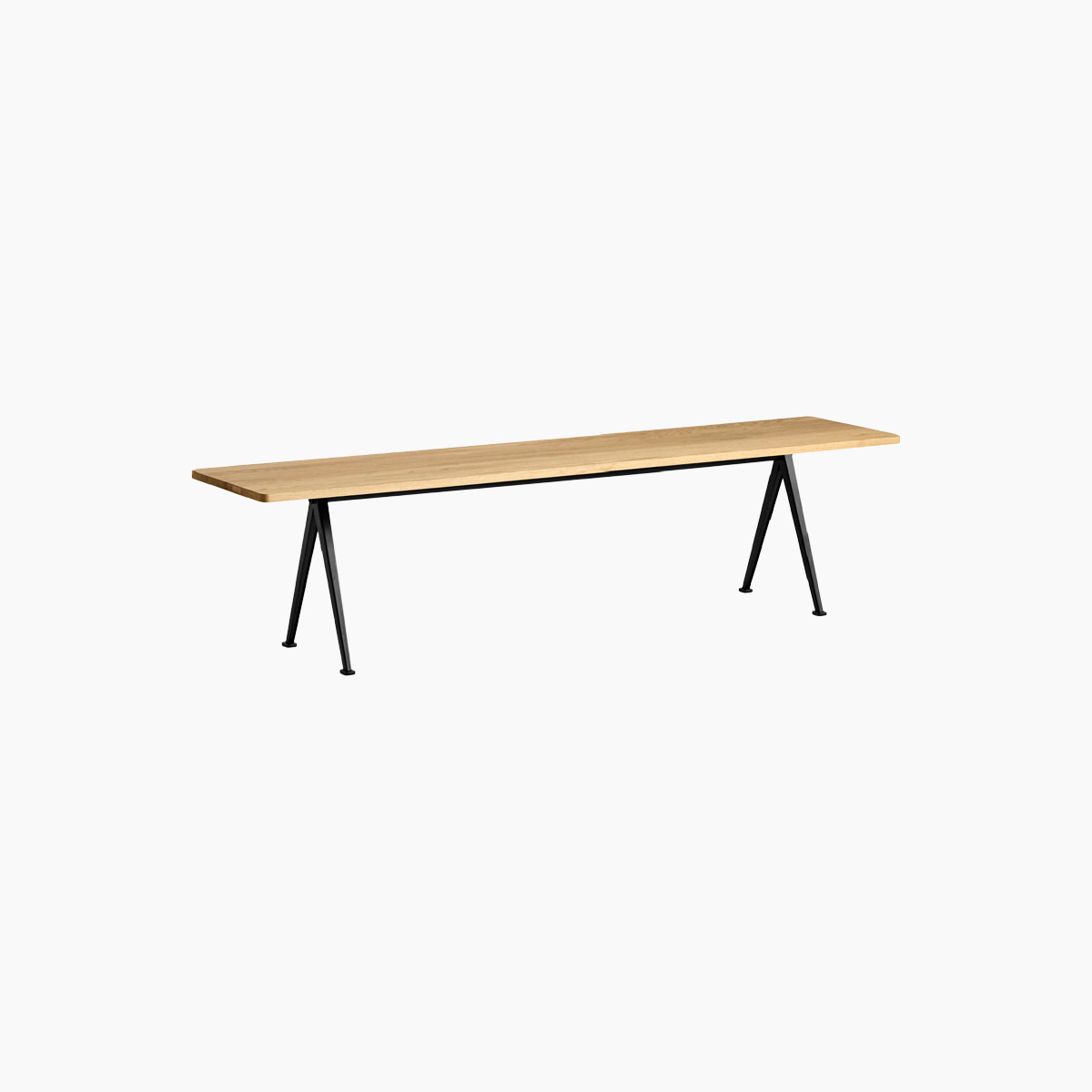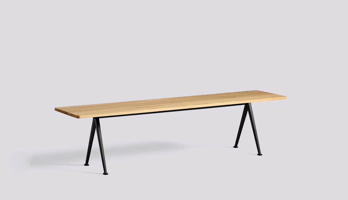 Designed to be functional, light and strong, the Pyramid Bench features a thin steel-sheet base with a rectangular oak top. Originally created by Wim Rietveld while working at Ahrend in the 1950s, the cutout steel collection has been relaunched by HAY together with Ahrend. The bench is available in several wood finishes and base colours that can be coordinated with the Pyramid Table, and can be used as a low side table or seating solution in a wide variety of domestic or corporate contexts.