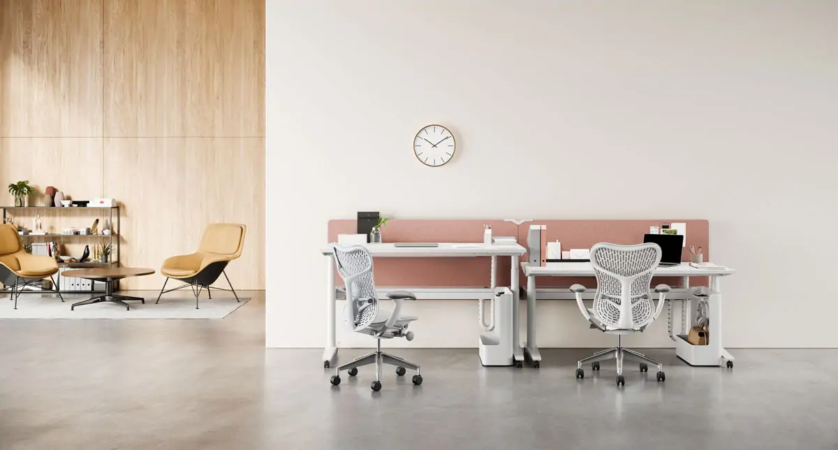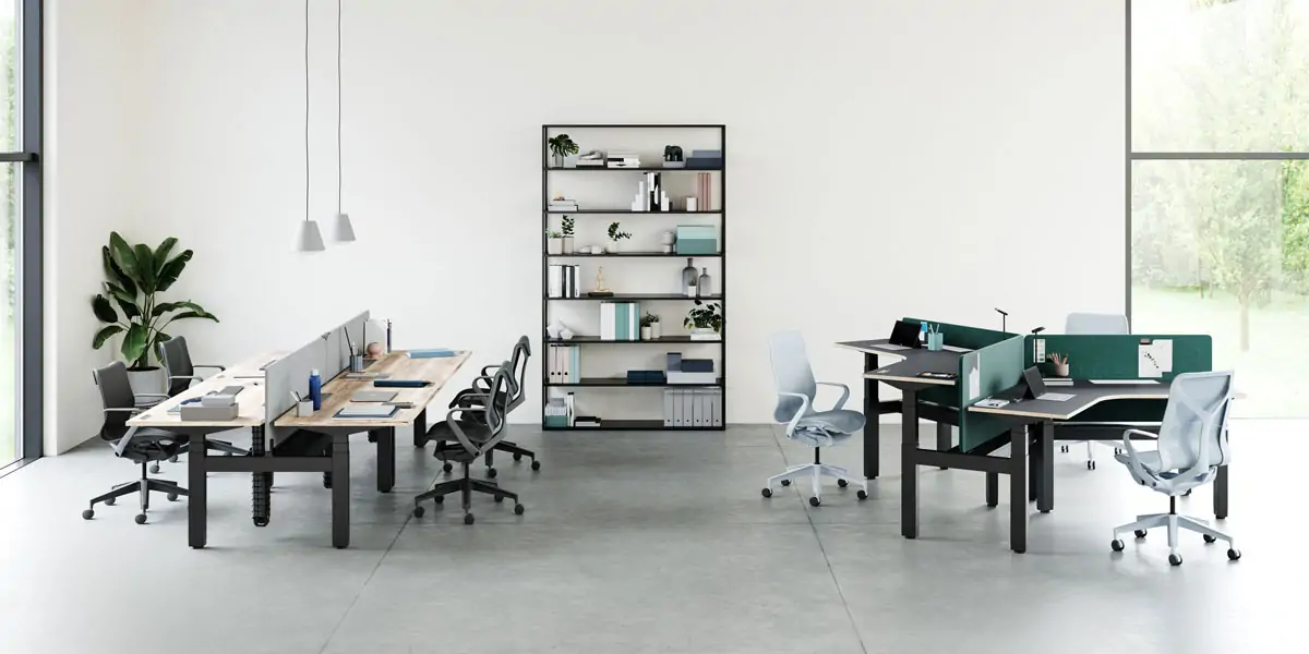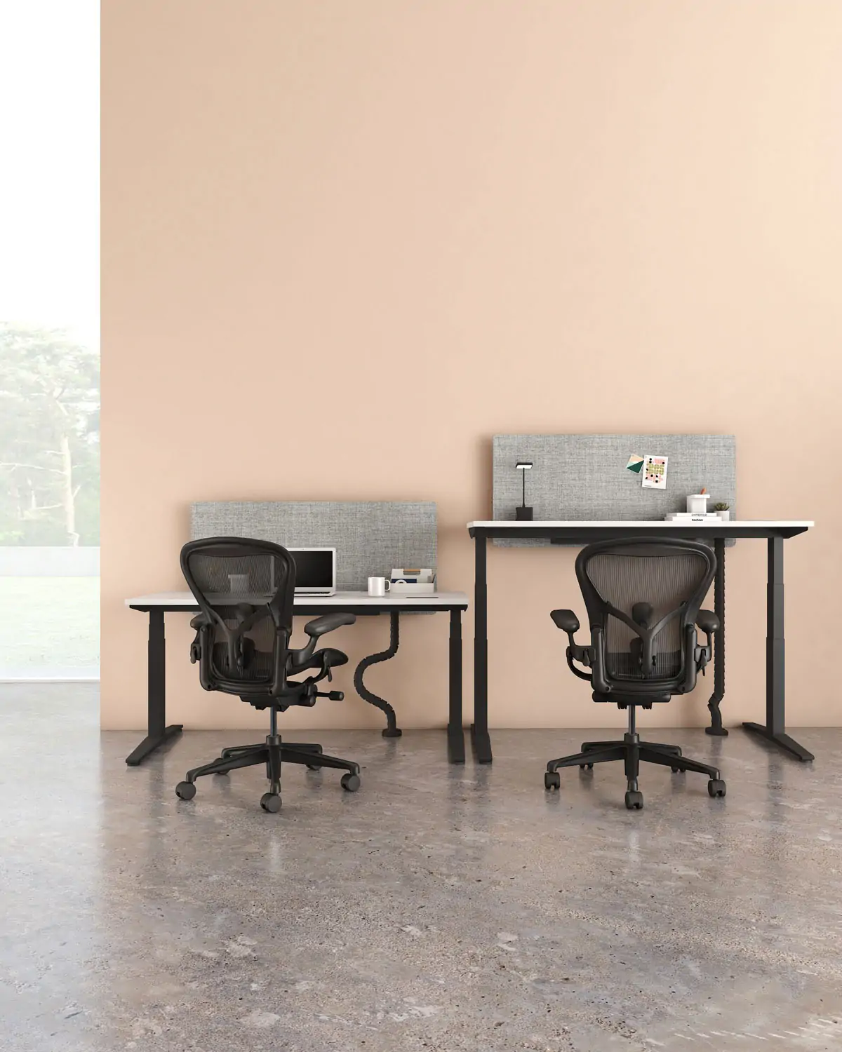 The Herman Miller Ratio Sit-to-Stand Desk is a premium, electric height-adjustable desk designed to facilitate seamless transitions between sitting and standing, promoting a healthier, more dynamic work environment. It features intuitive one-touch controls, a lightweight, clean-lined design with round or rectangular leg options, and integrated cable management. The desk is available in various finishes and sizes, including 1400mm to 1800mm widths