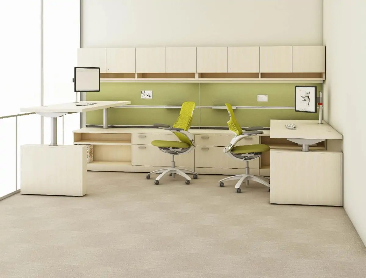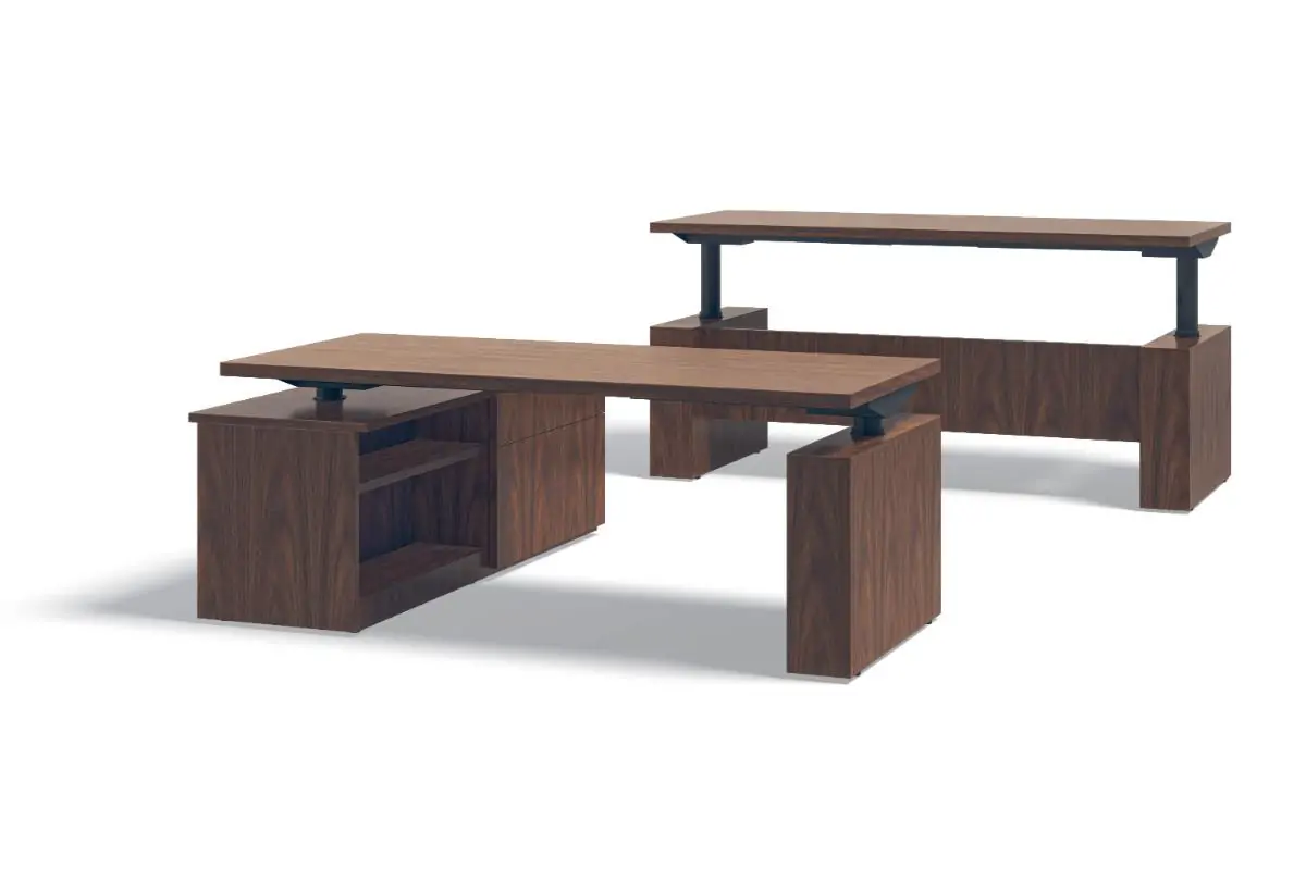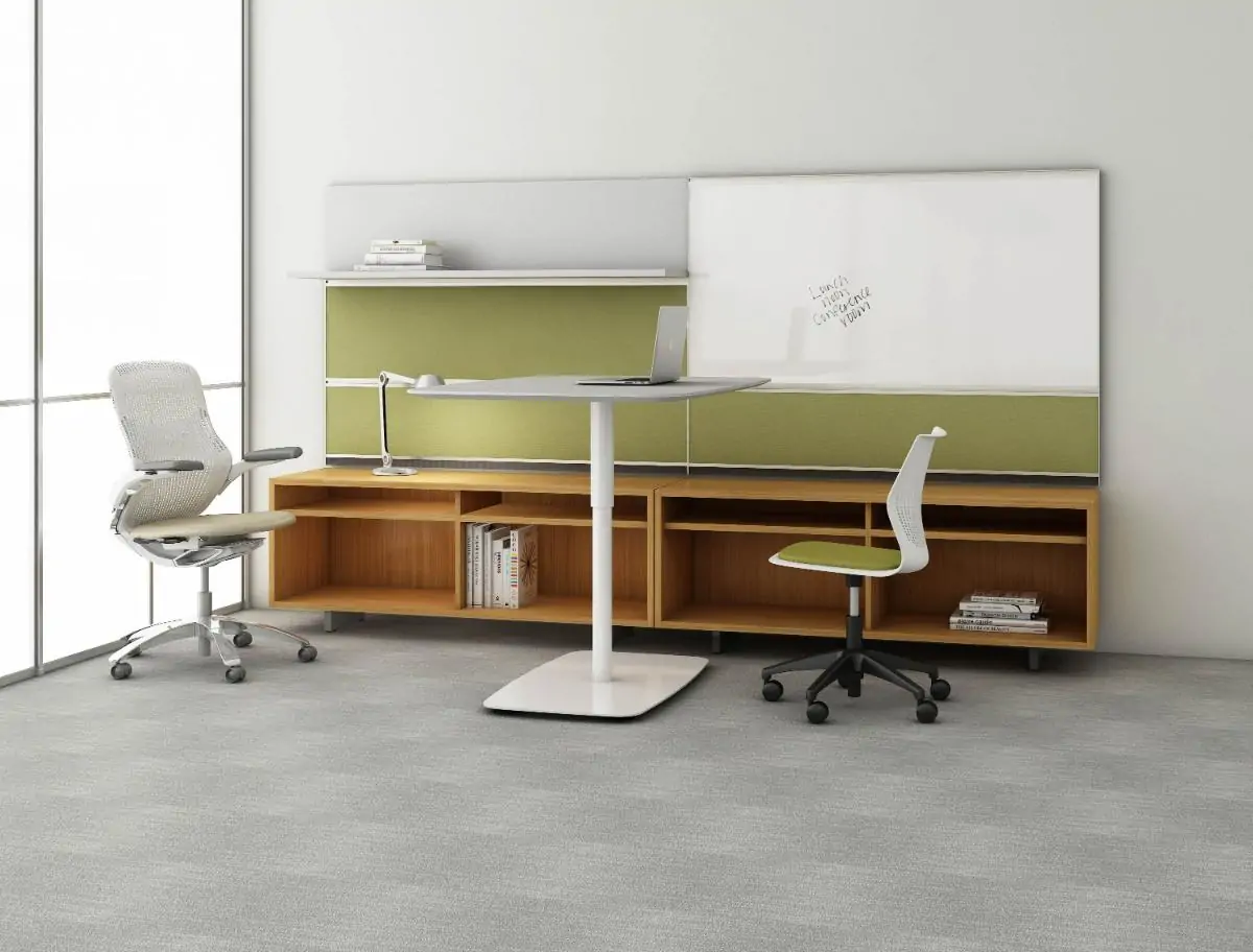 + Wall-mounted height-adjustable desk features a modesty with a hinged door for easy access to cables and wall outlets