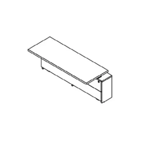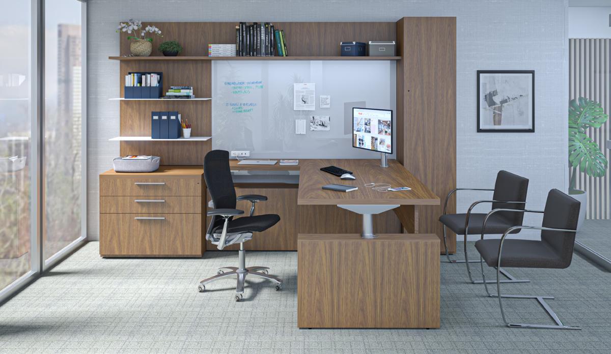 + Wall-mounted height-adjustable desk features a modesty with a hinged door for easy access to cables and wall outlets