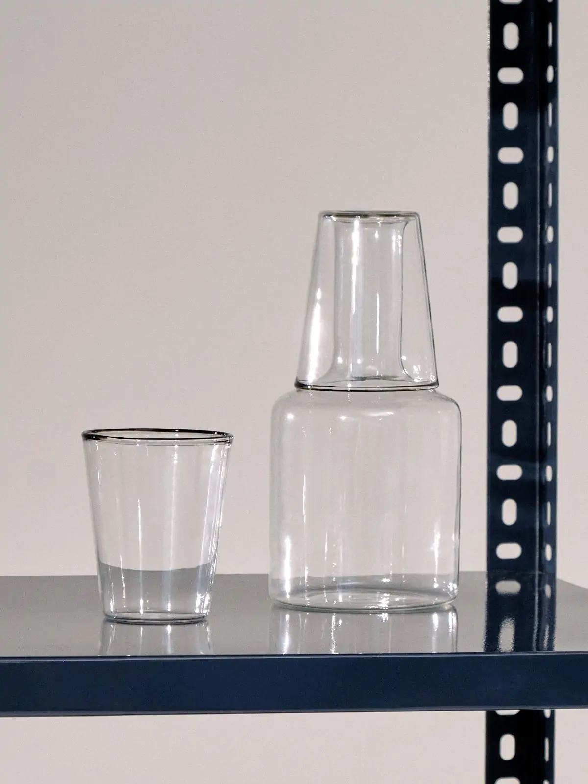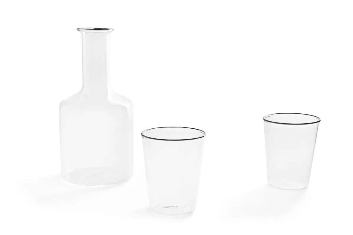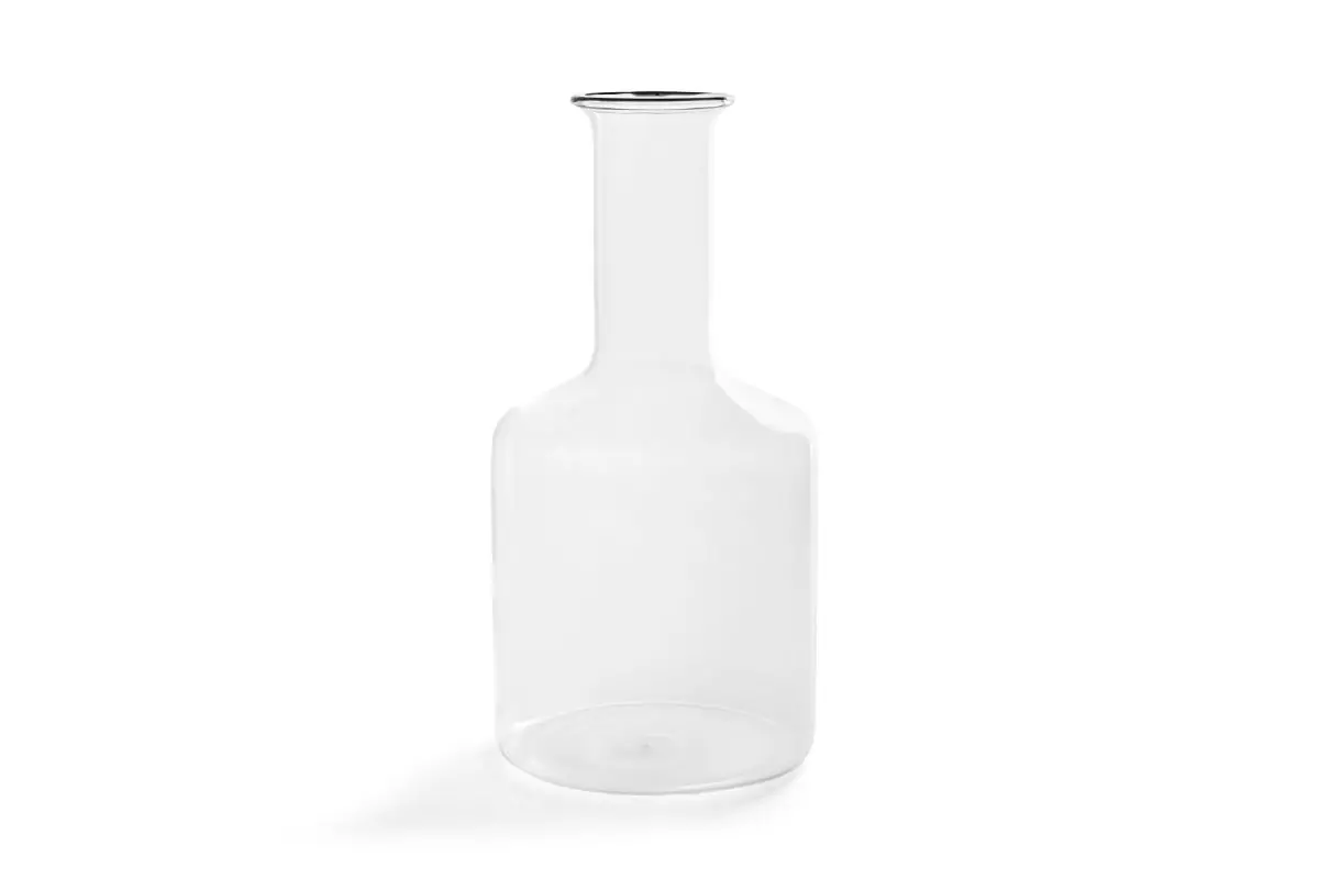 Made in resilient borosilicate glass and featuring a slim funnel neck with contrast trim at the top, Rim Carafe provides a decorative and functional vessel for storing and pouring water, wine, and other drinks. Use alone or with the matching glasses that are designed to be placed over the top.