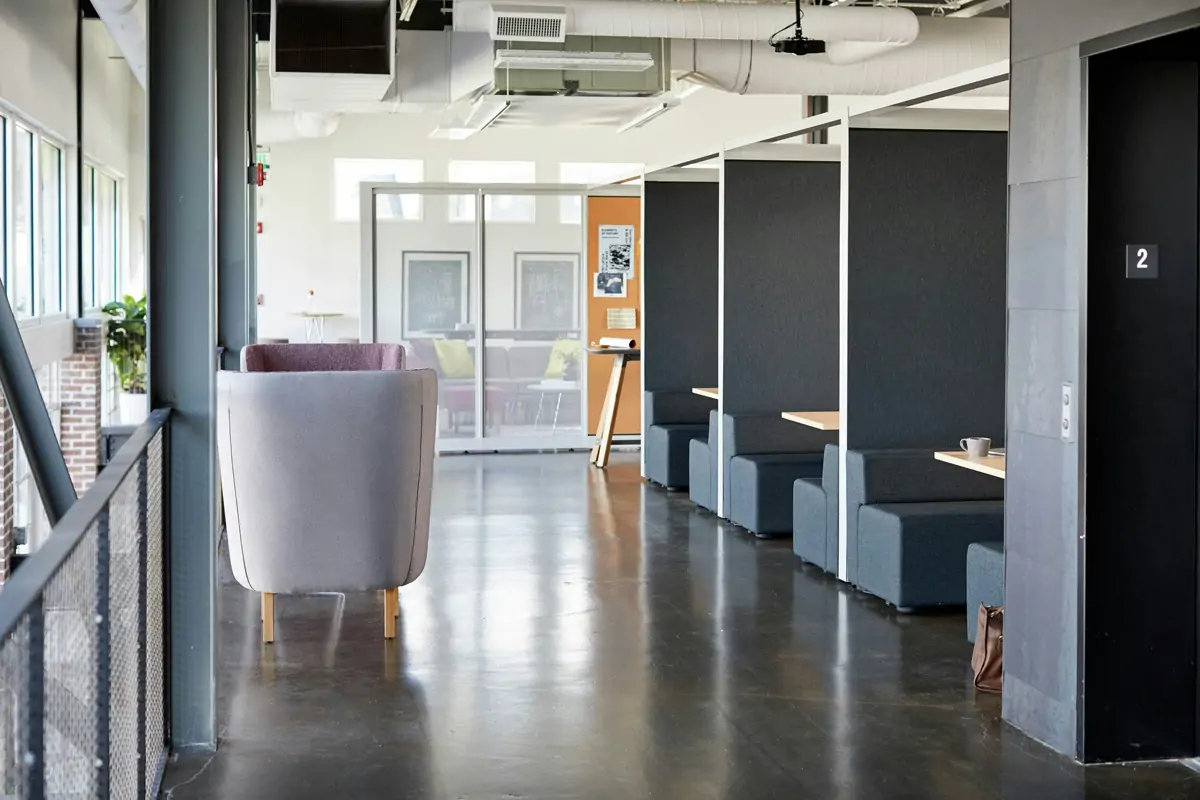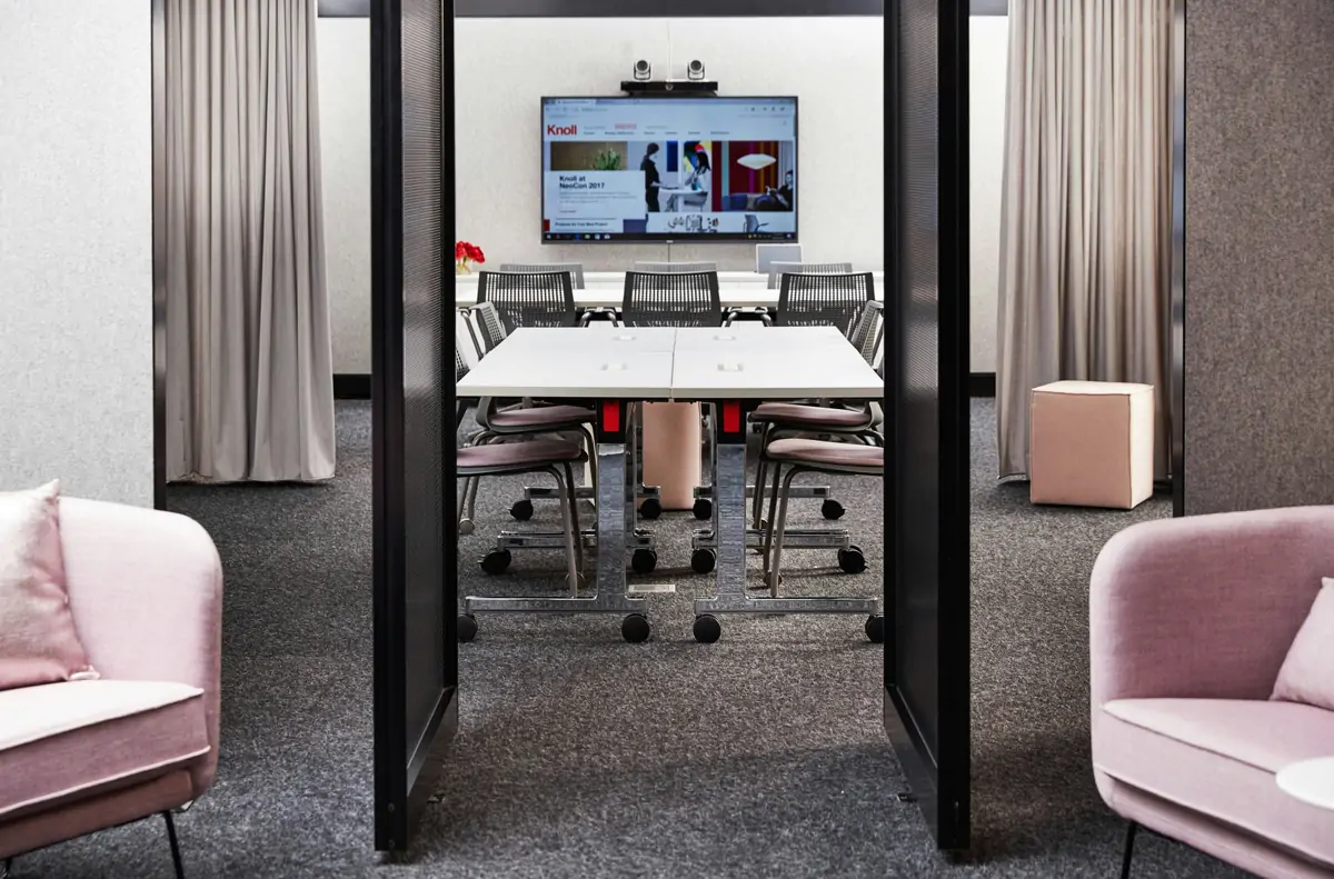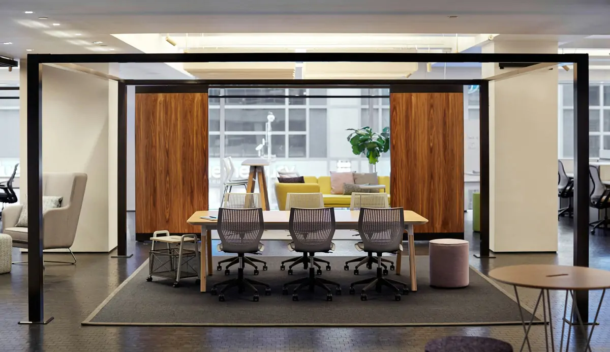 Delineate the open plan and maximize performance by dropping in a freestanding wall with a white board or TV monitor for easy collaboration.