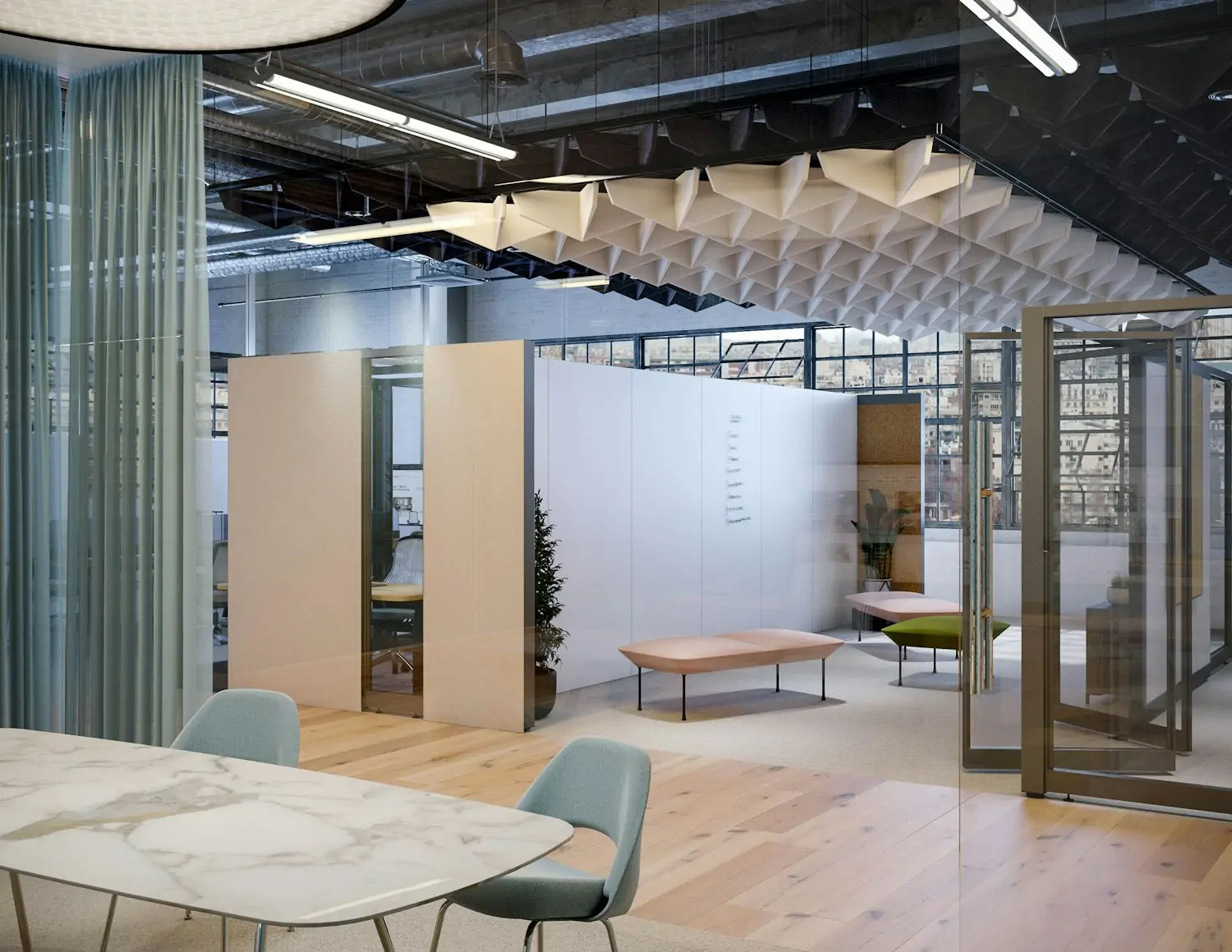 Delineate the open plan and maximize performance by dropping in a freestanding wall with a white board or TV monitor for easy collaboration.