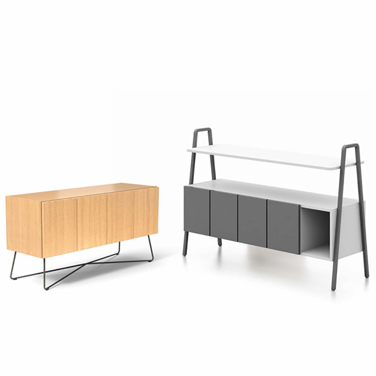 Rockwell Unscripted credenzas and consoles serve the group, from books to equipment to drinks. Use them in the open plan to delineate space or to complement Creative Walls, steps or lounge pieces. Wire base or modular storage uprights elevate the case for a lighter aesthetic.